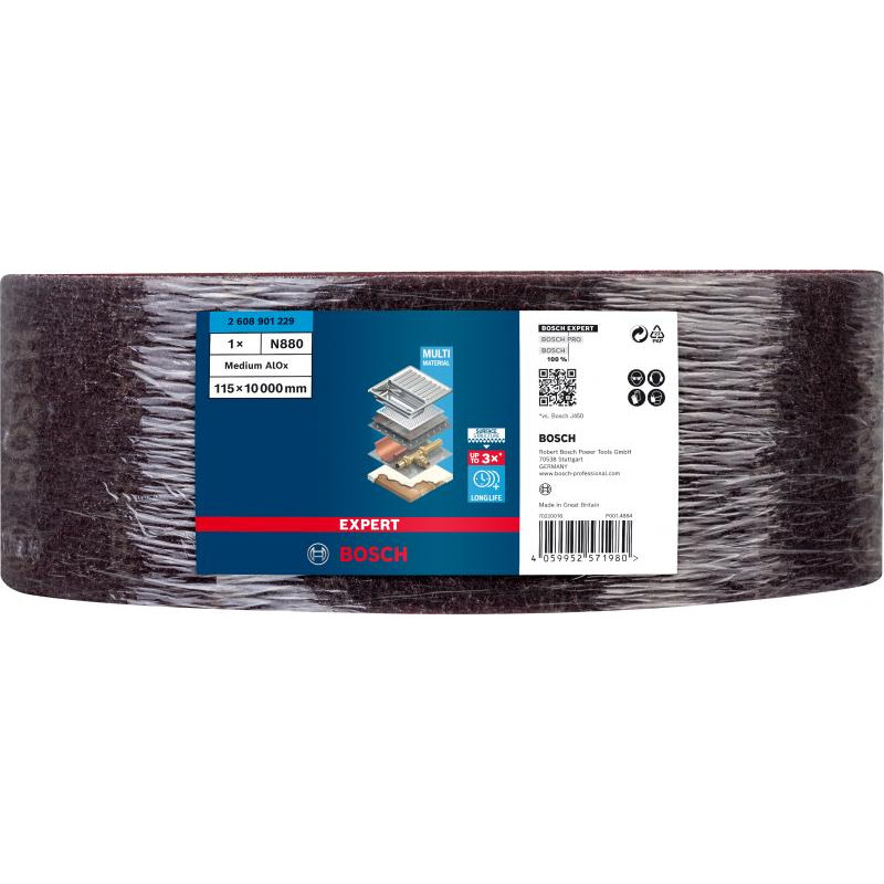 Emballage: 1Marque: BoschRéférence: 2608901229EAN: 4059952571980Description: EXPERT Rouleau abrasif sur non-tissé, medium A, 115 mm x 10 m