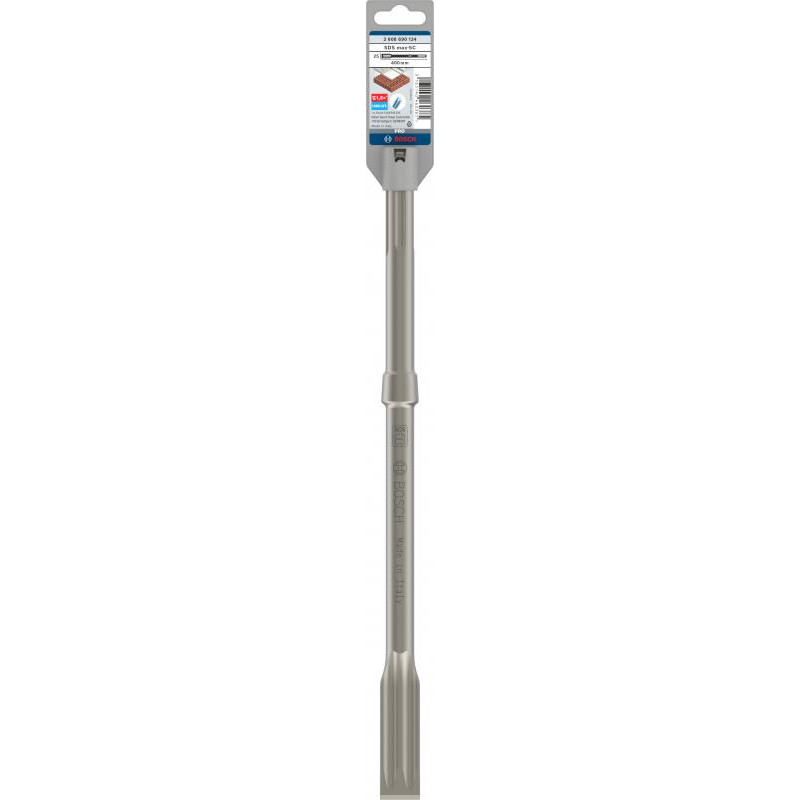 Emballage: 1Marque: BoschRéférence: 2608690124EAN: 3165140460385Description: Burin plat PRO SDS max-5C auto affûtant 25x400 mm