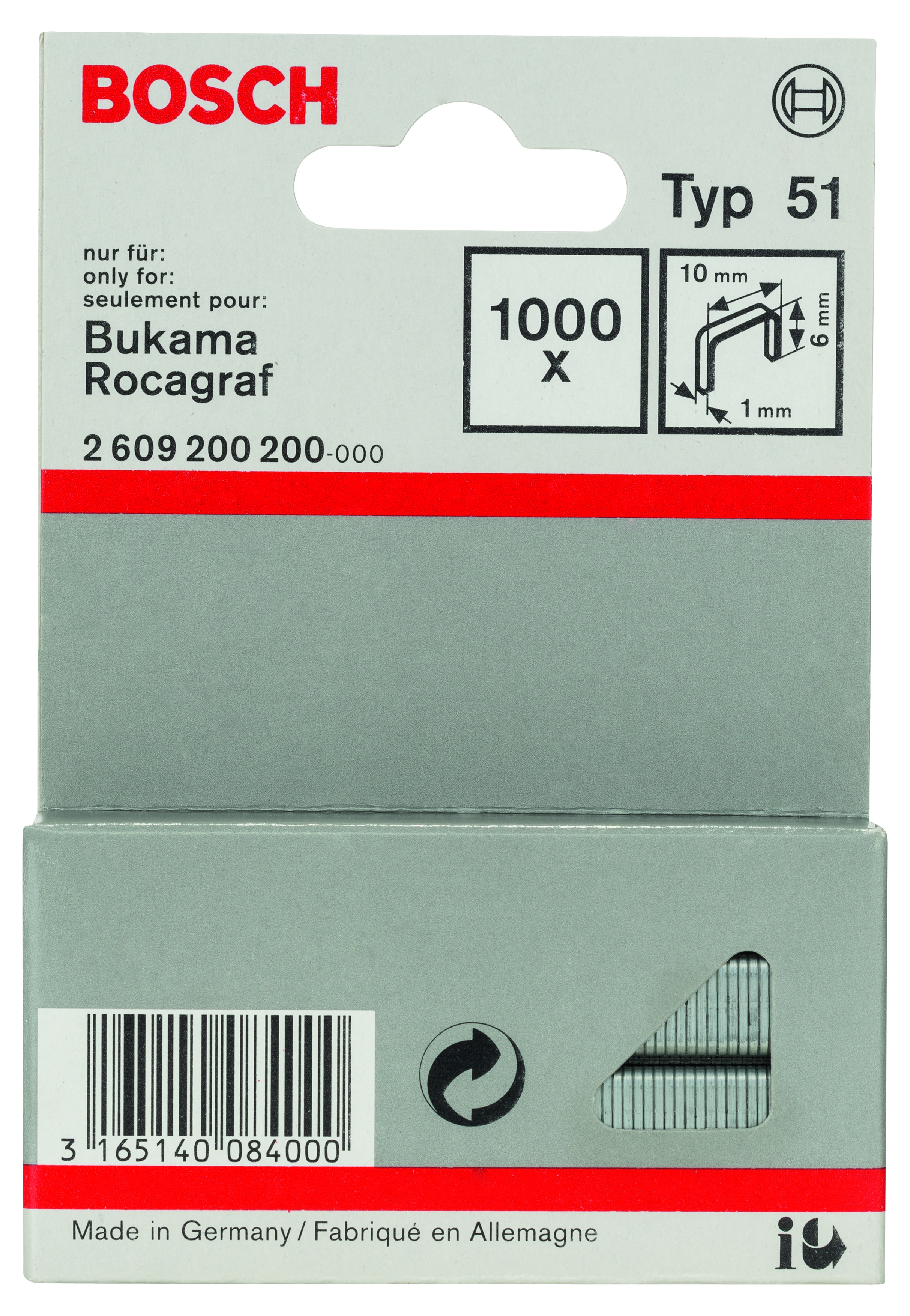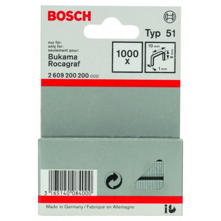 Emballage: 1000Marque: BoschRéférence: 2609200200EAN: 3165140084000Description: Agrafe à fil plat de type 51- 10 x 1 x 6 mm 1000x