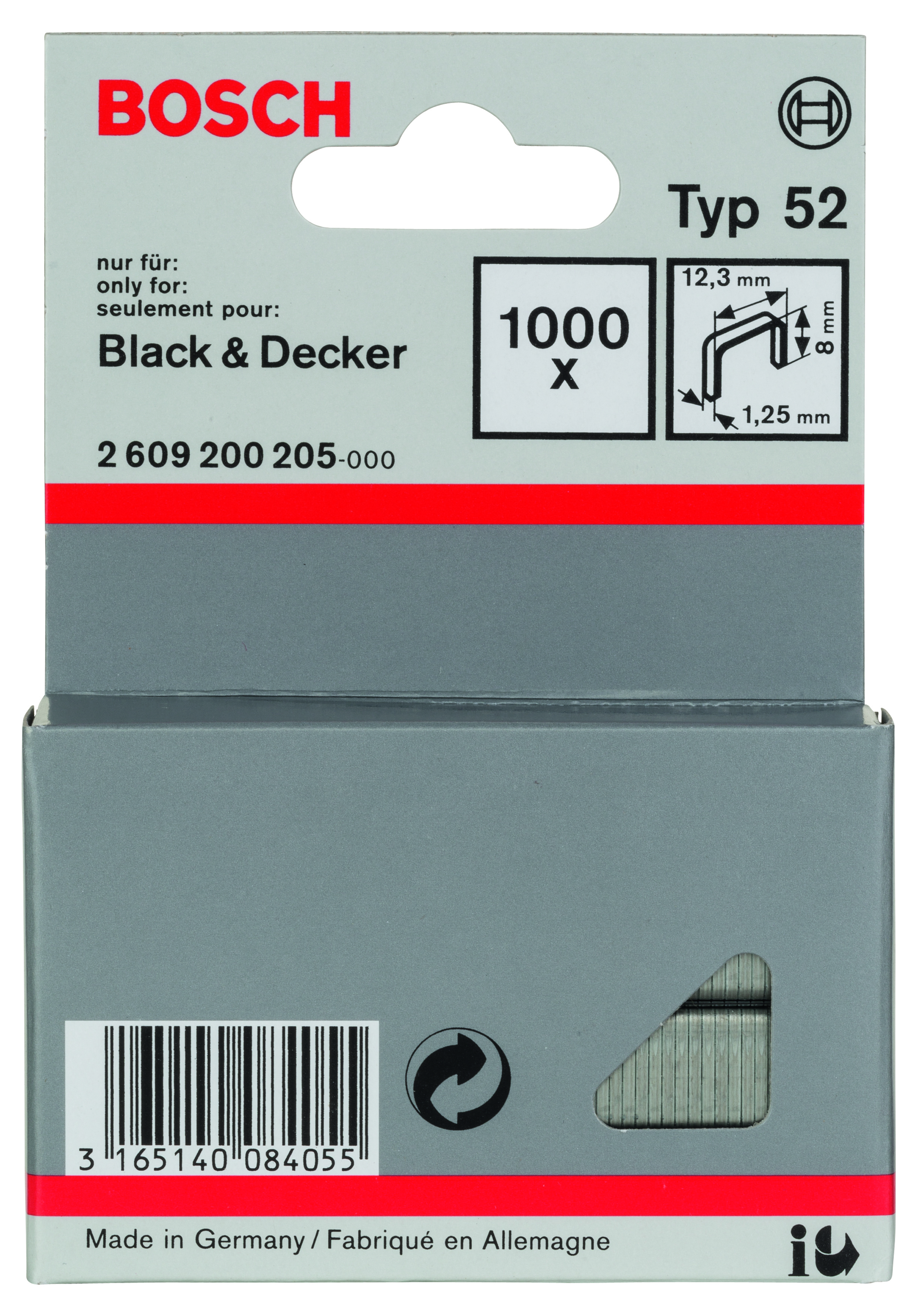 Emballage: 1000Marque: BoschRéférence: 2609200205EAN: 3165140084055Description: Agrafe à fil plat de type 52- 12,3 x 1,25 x 8 mm 1000x