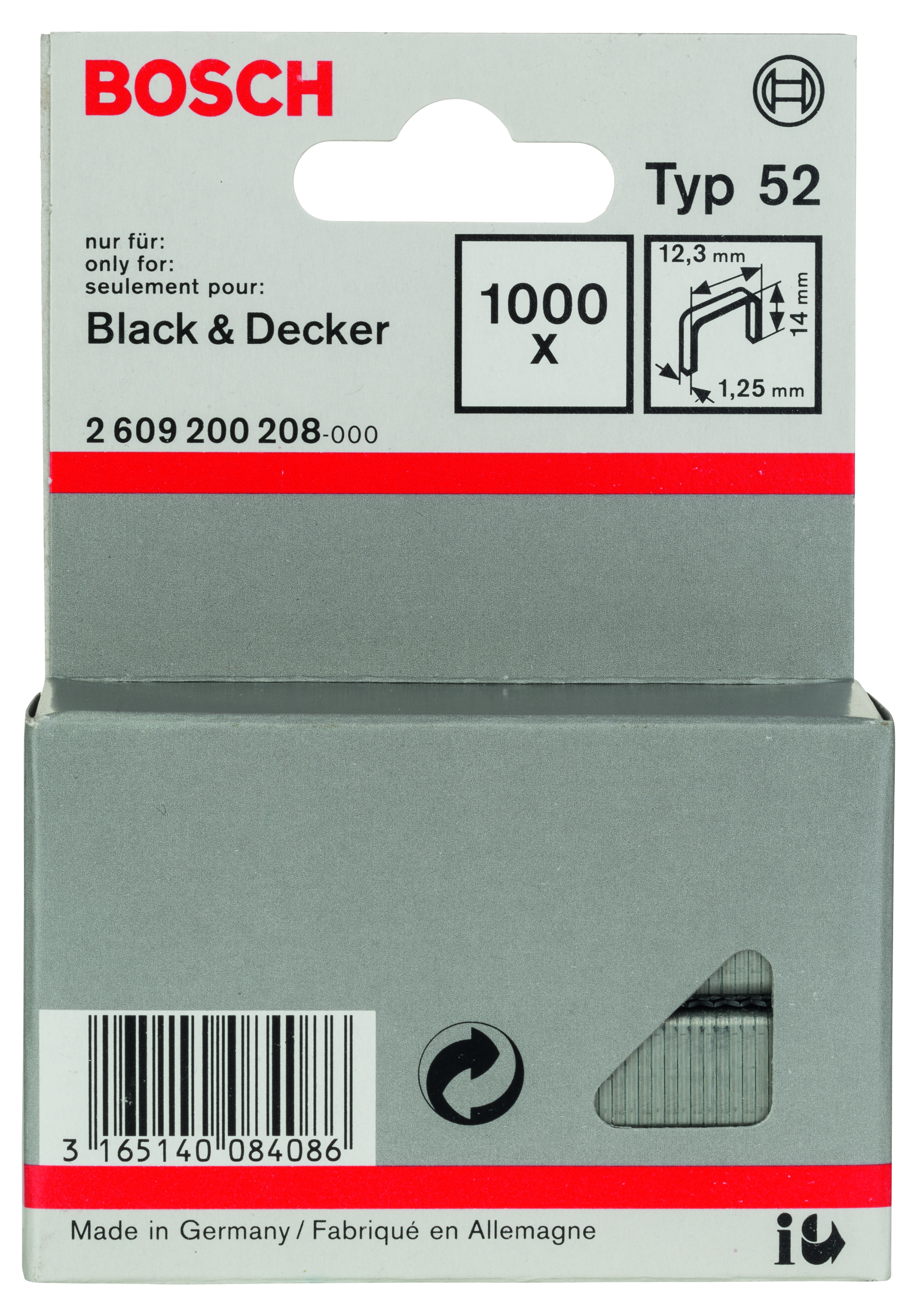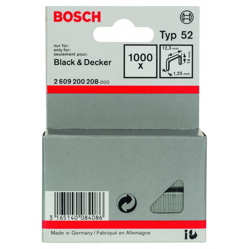 Emballage: 1000Marque: BoschRéférence: 2609200208EAN: 3165140084086Description: Agrafe à fil plat de type 52- 12,3 x 1,25 x 14 mm 1000x