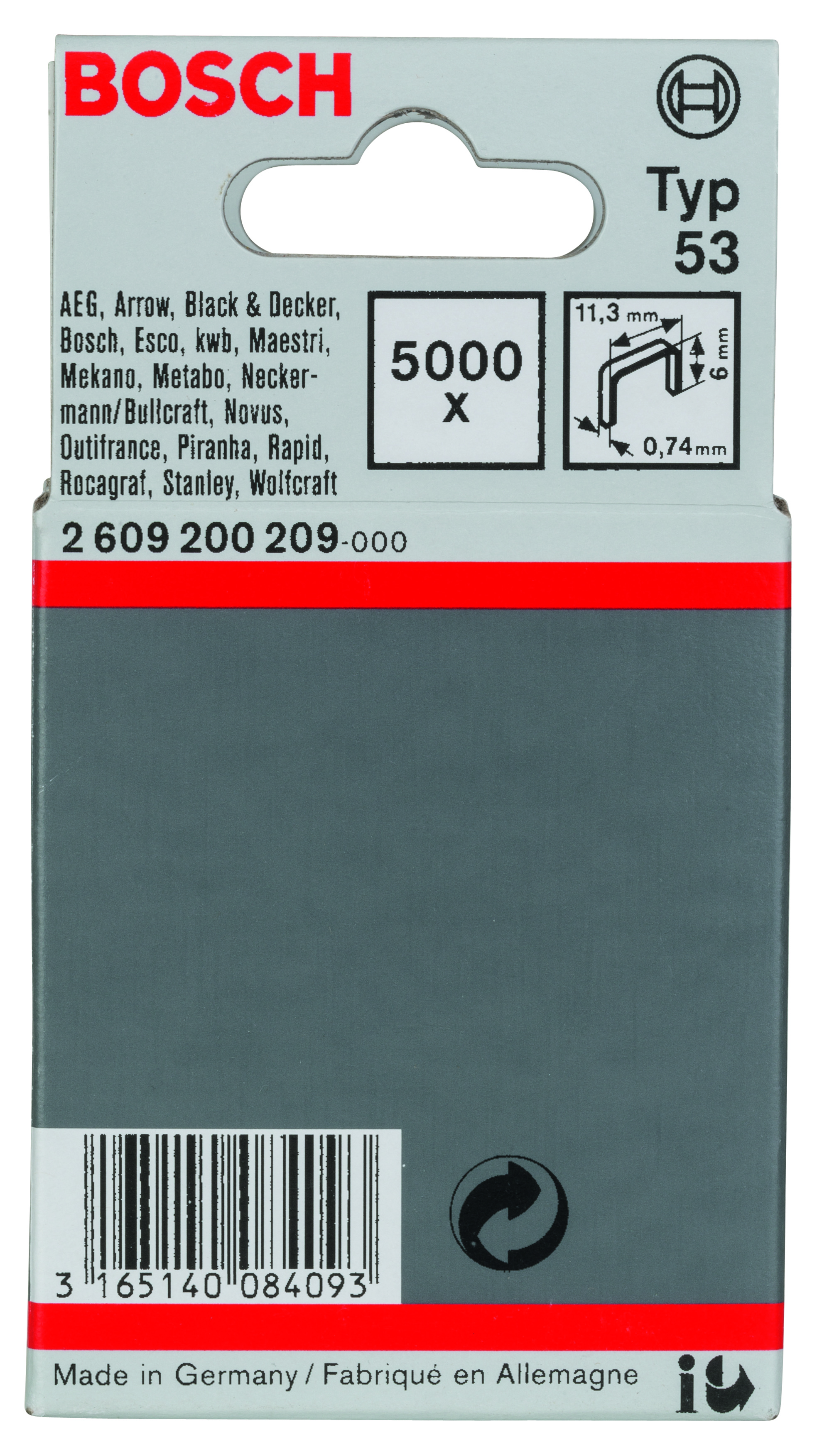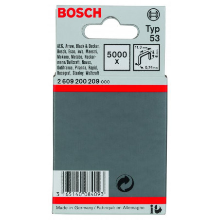 Emballage: 5000Marque: BoschRéférence: 2609200209EAN: 3165140084093Description: Agrafe à fil fin de type 53- 11,4 x 0,74 x 6 mm 5000x