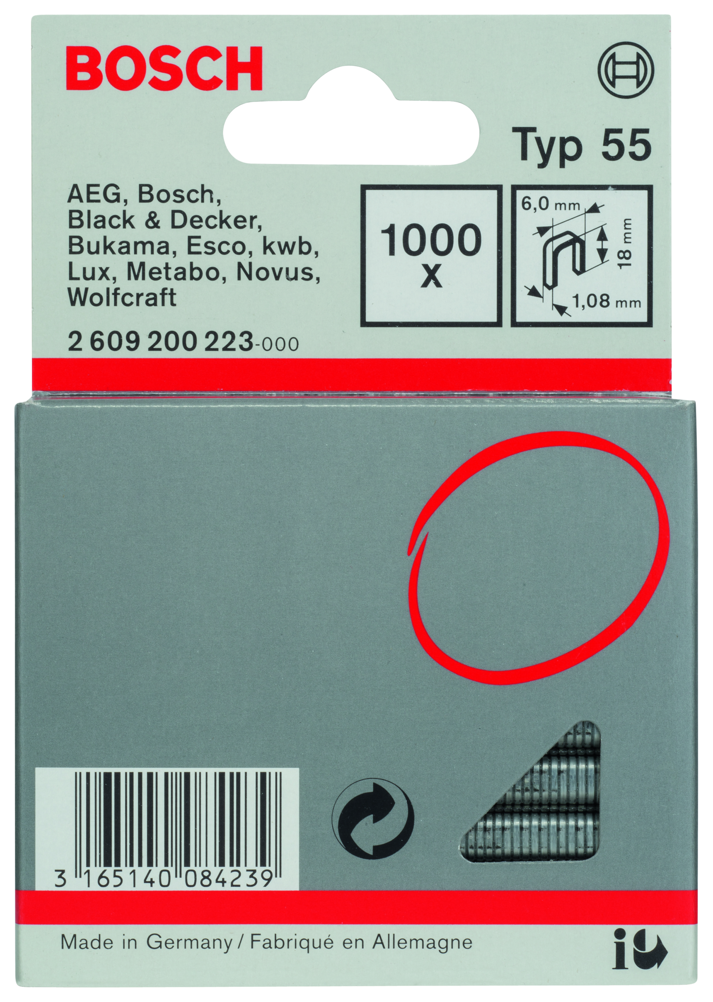 Emballage: 1000Marque: BoschRéférence: 2609200223EAN: 3165140084239Description: Agrafe à dos étroit de type 55 6 x 1,08 x 18 mm 1000x