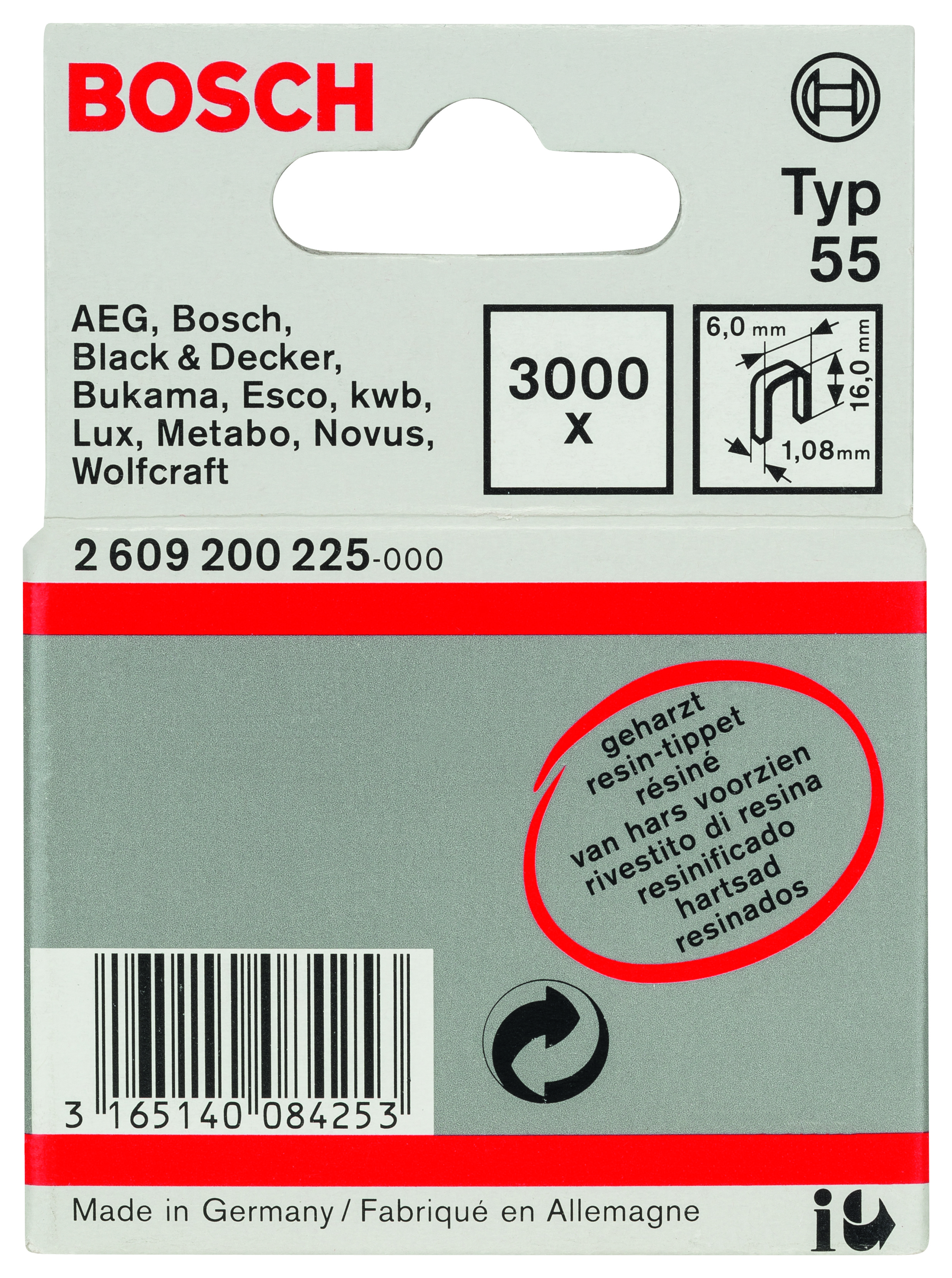 Emballage: 3000Marque: BoschRéférence: 2609200225EAN: 3165140084253Description: Agrafe à dos étroit type 55 résinée 6 x 1,08 x 16 mm 3000x