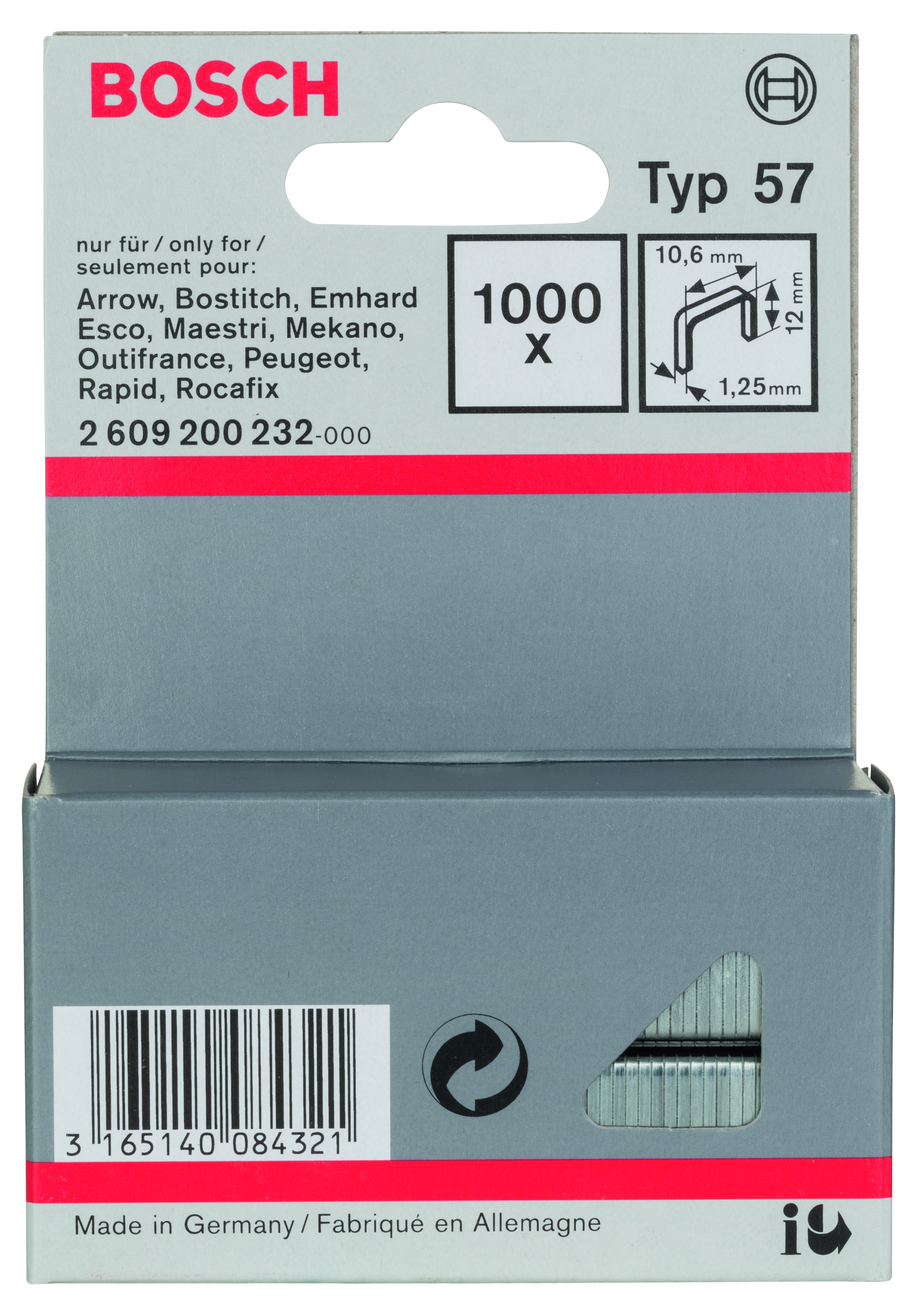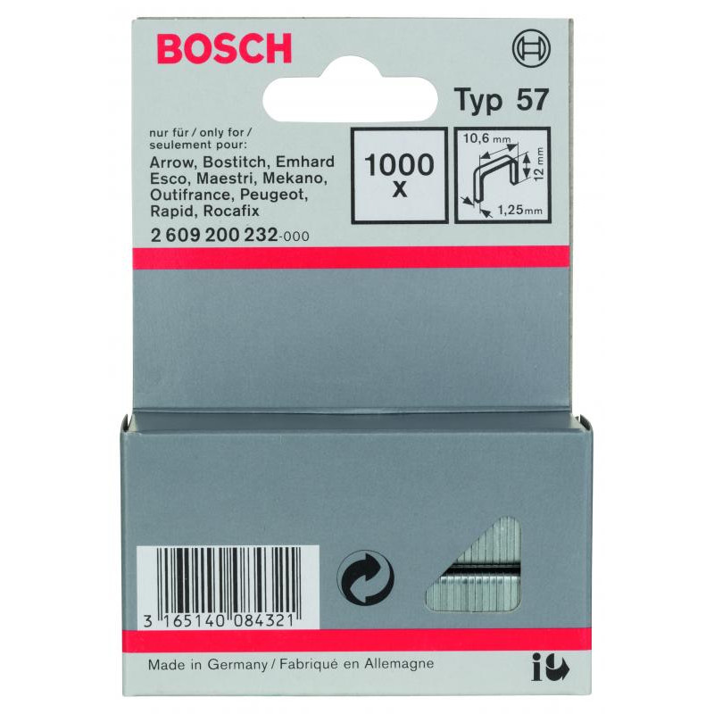 Emballage: 1000Marque: BoschRéférence: 2609200232EAN: 3165140084321Description: Agrafe à fil plat de type 57- 10,6 x 1,25 x 12 mm 1000x