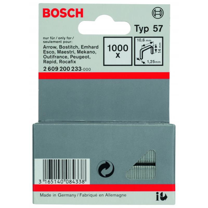 Emballage: 1000Marque: BoschRéférence: 2609200233EAN: 3165140084338Description: Agrafe à fil plat de type 57- 10,6 x 1,25 x 14 mm 1000x