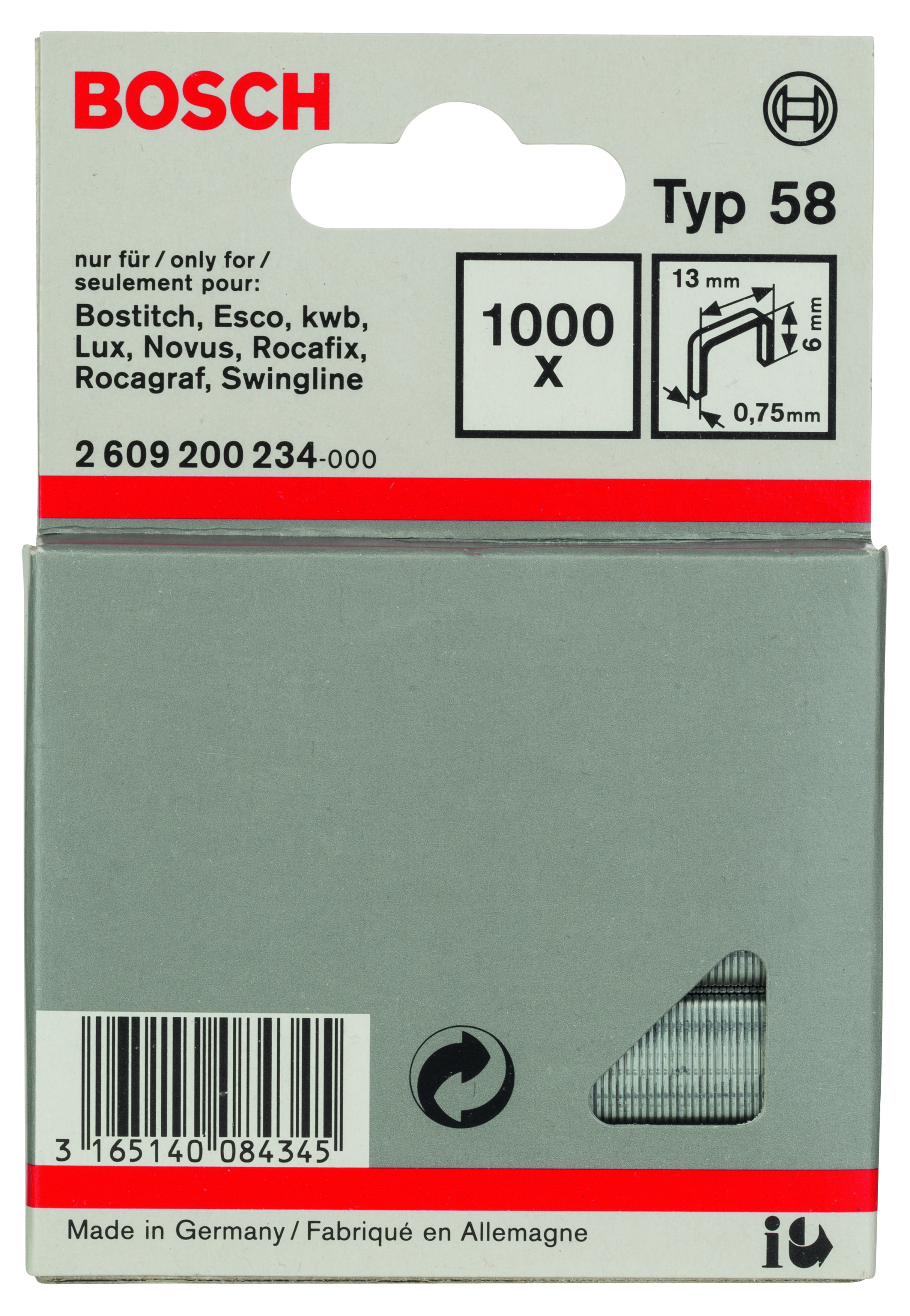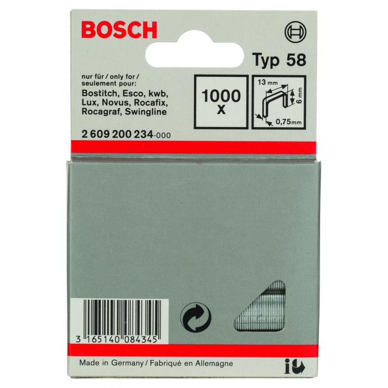 Emballage: 1000Marque: BoschRéférence: 2609200234EAN: 3165140084345Description: Agrafe à fil fin de type 58- 13 x 0,75 x 6 mm 1000x