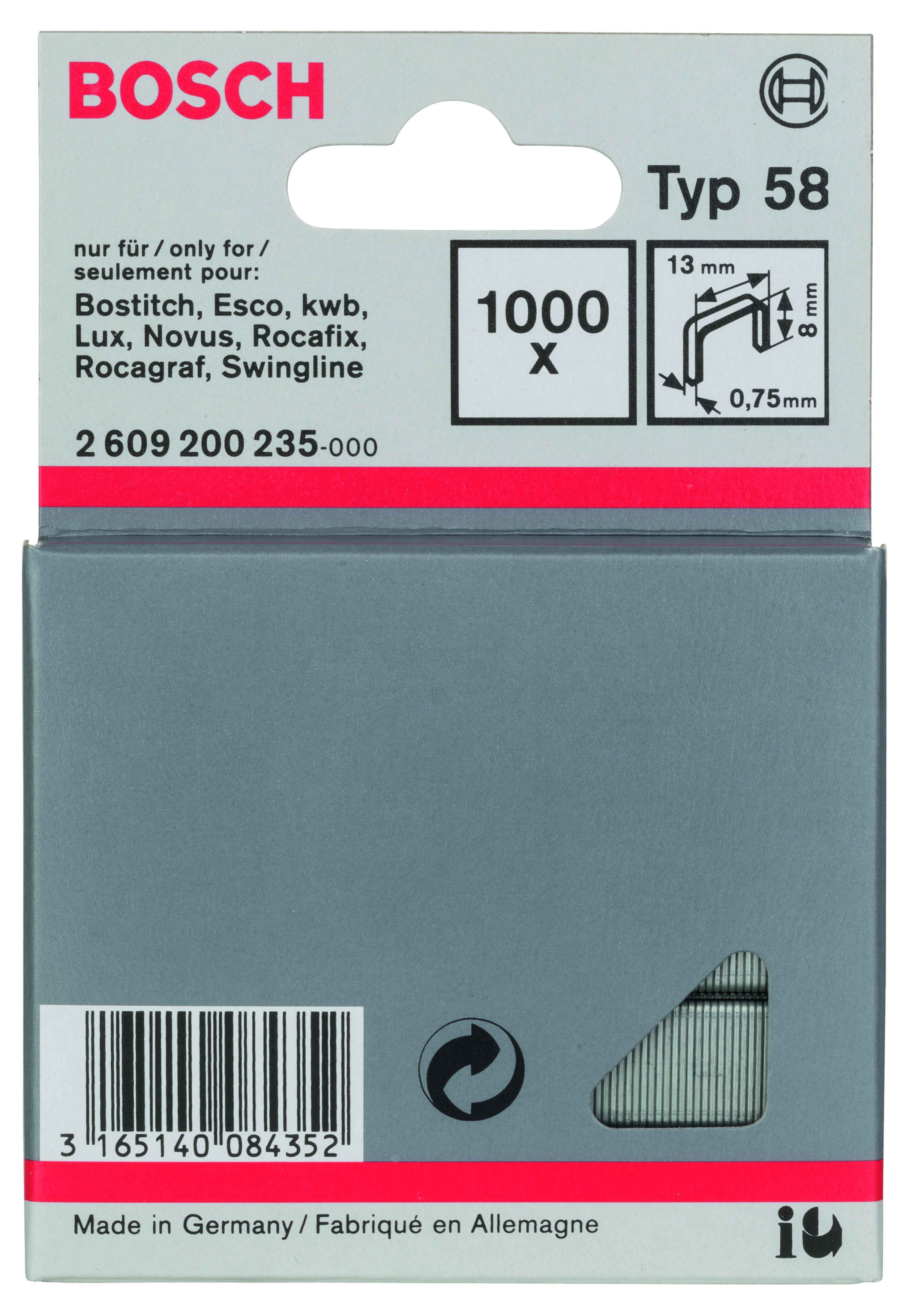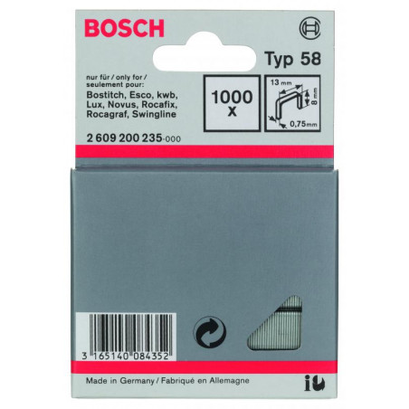 Emballage: 1000Marque: BoschRéférence: 2609200235EAN: 3165140084352Description: Agrafe à fil fin de type 58- 13 x 0,75 x 8 mm 1000x
