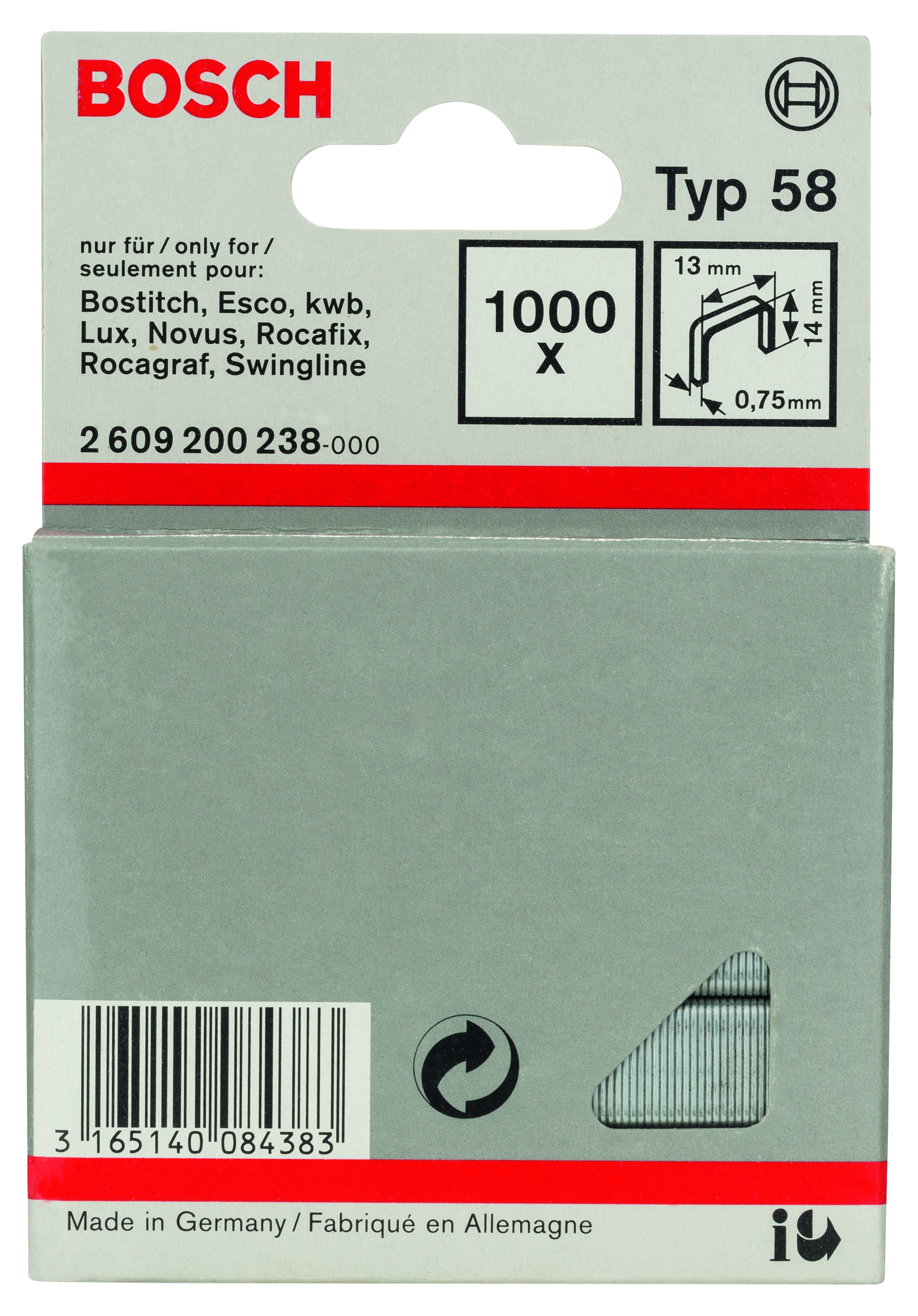 Emballage: 1000Marque: BoschRéférence: 2609200238EAN: 3165140084383Description: Agrafe à fil fin de type 58- 13 x 0,75 x 14 mm 1000x