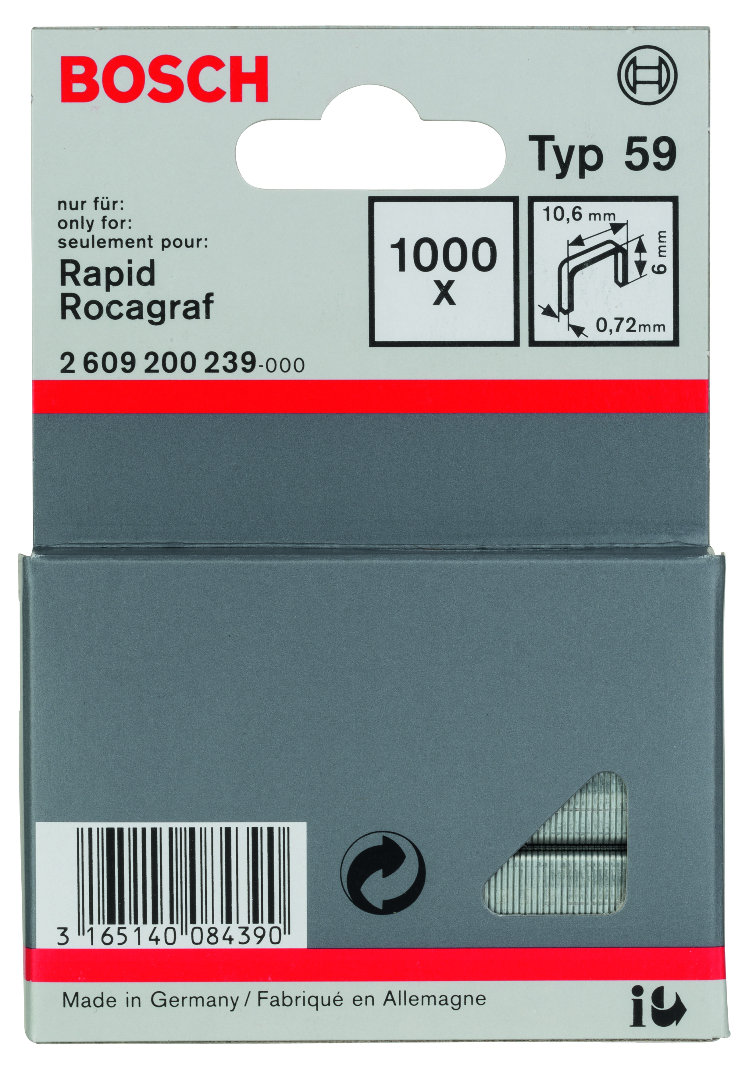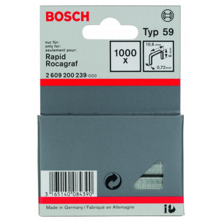 Emballage: 1000Marque: BoschRéférence: 2609200239EAN: 3165140084390Description: Agrafe à fil fin de type 59- 10,6 x 0,72 x 6 mm 1000x