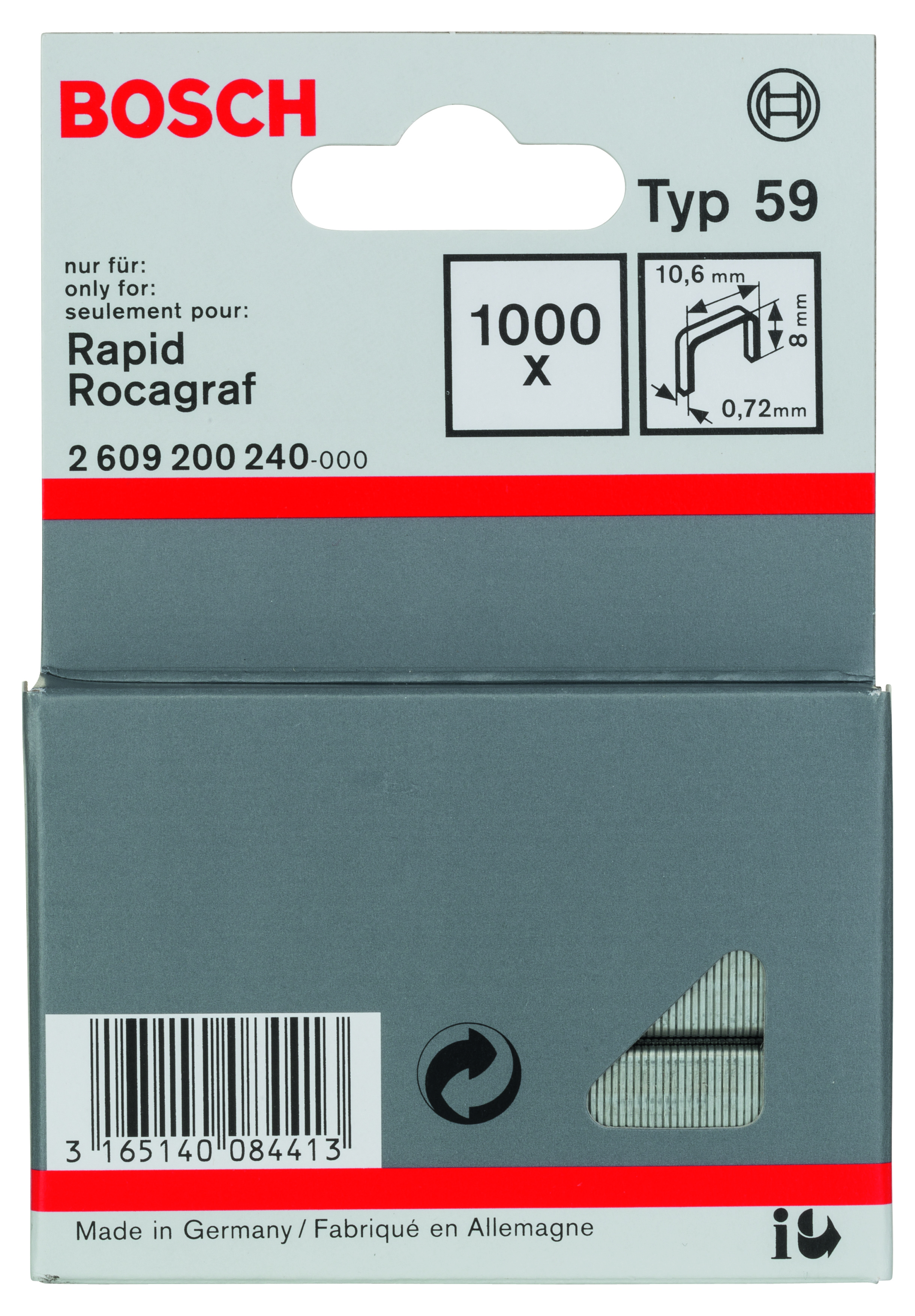 Emballage: 1000Marque: BoschRéférence: 2609200240EAN: 3165140084413Description: Agrafe à fil fin de type 59- 10,6 x 0,72 x 8 mm 1000x