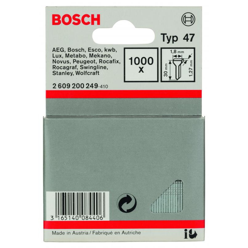 Emballage: 1000Marque: BoschRéférence: 2609200249EAN: 3165140084406Description: Clou type 47- 1,8 x 1,27 x 30 mm 1000x