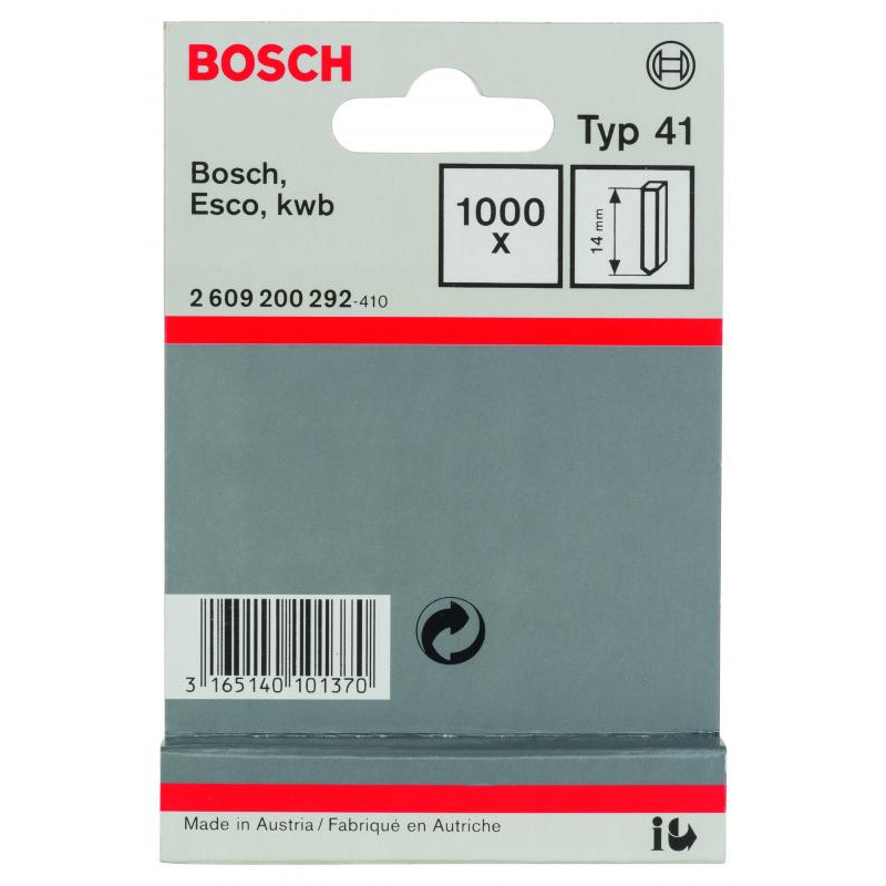 Emballage: 1000Marque: BoschRéférence: 2609200292EAN: 3165140101370Description: Pointe de type 41- 14 mm 1000x