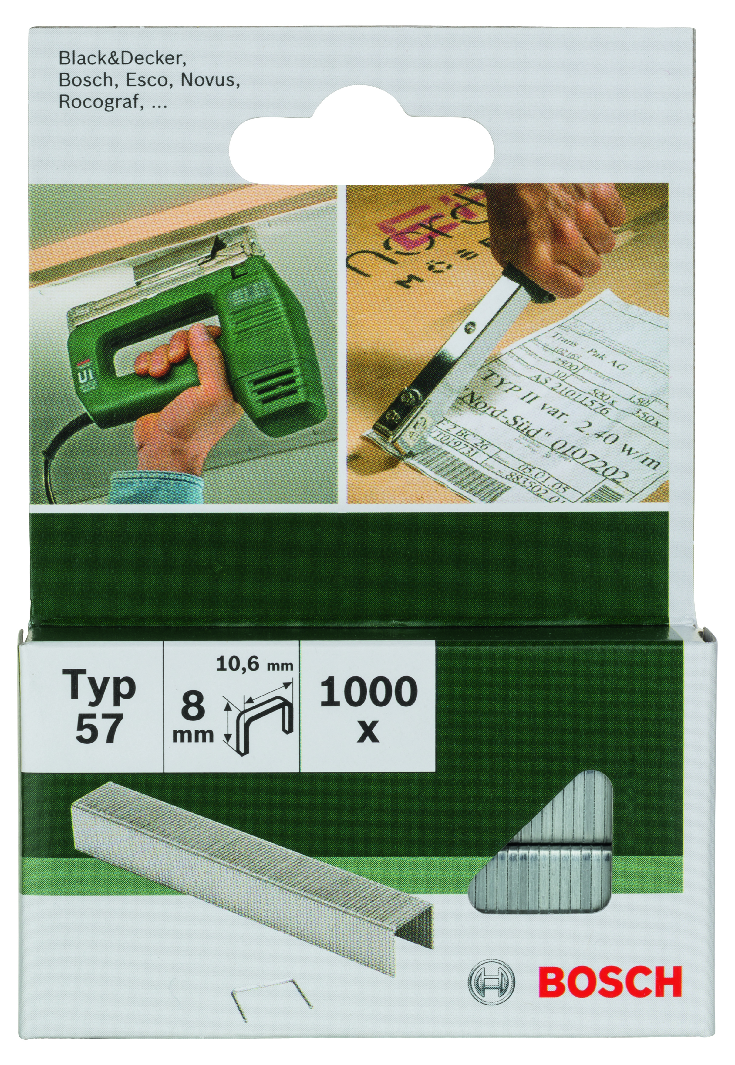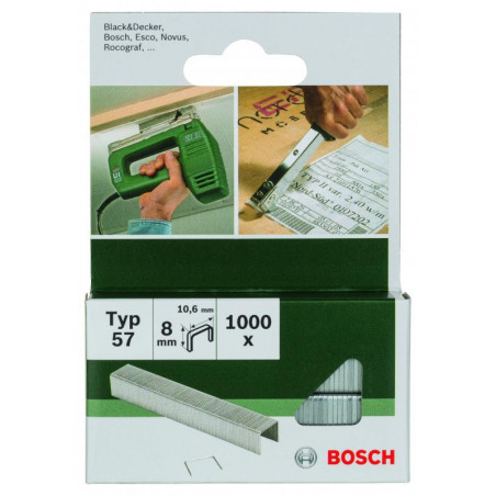 Emballage: 1000Marque: BoschRéférence: 2609255846EAN: 3165140392976Description: CLOUS MP (AGRAFES 57 10.6X1.25X8MM (1000))