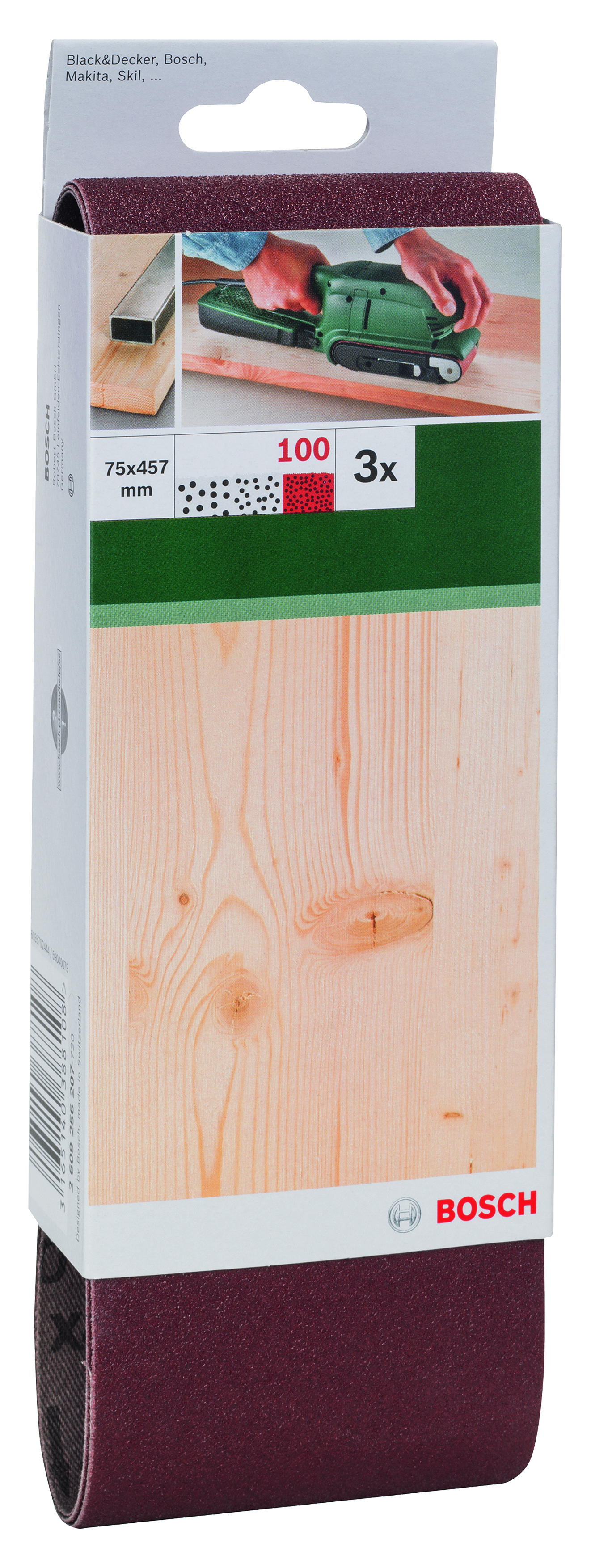 Emballage: 3Marque: BoschRéférence: 2609256207EAN: 3165140388108Description: PONÇAGE MP (SANDING BELT 75X457 MM , G100, WOOD, NON PERF., FIXATION ÉTRIER, (3))