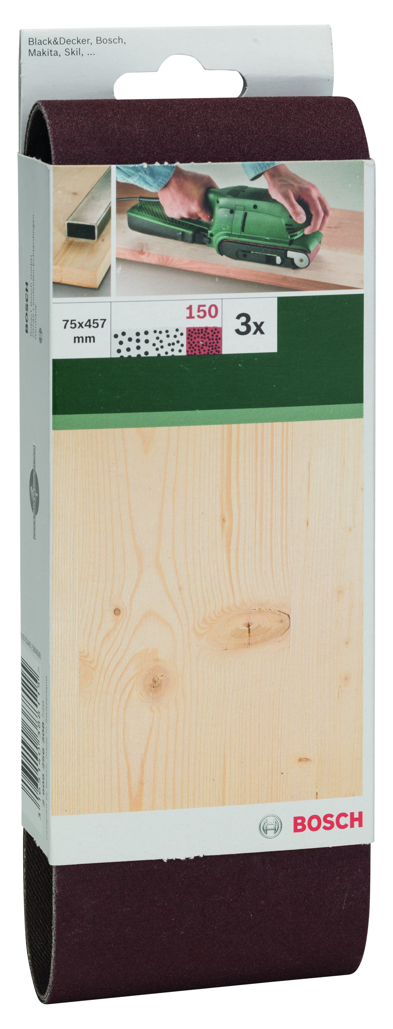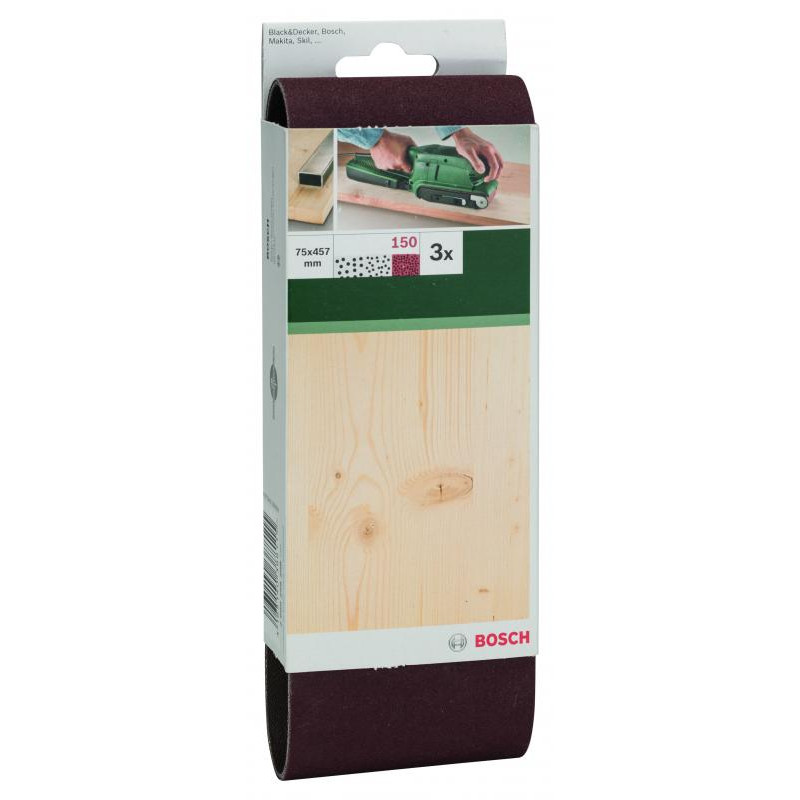 Emballage: 3Marque: BoschRéférence: 2609256208EAN: 3165140388115Description: PONÇAGE MP (BANDE ABRASIVE 75X457 MM , G150, RW, NON PERF., FIXATION ÉTRIER (3))