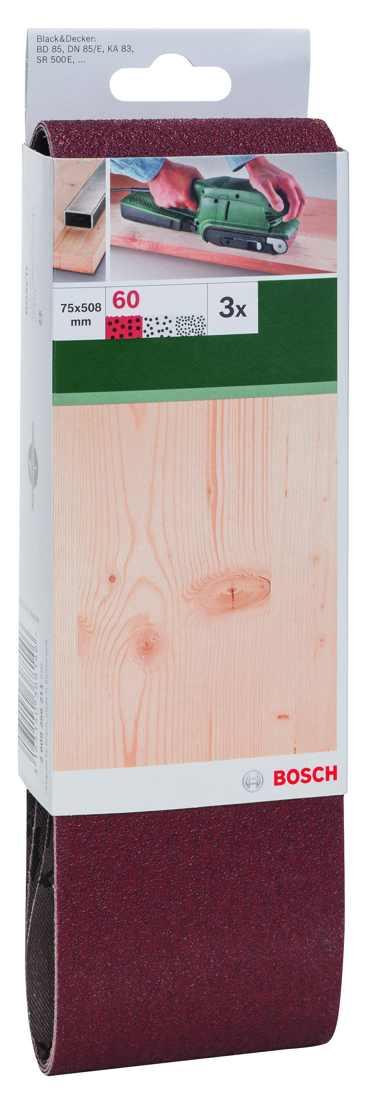 Emballage: 3Marque: BoschRéférence: 2609256211EAN: 3165140388146Description: PONÇAGE MP (BANDE ABRASIVE 75X508 MM , G60, RW, NON PERF., FIXATION ÉTRIER (3))