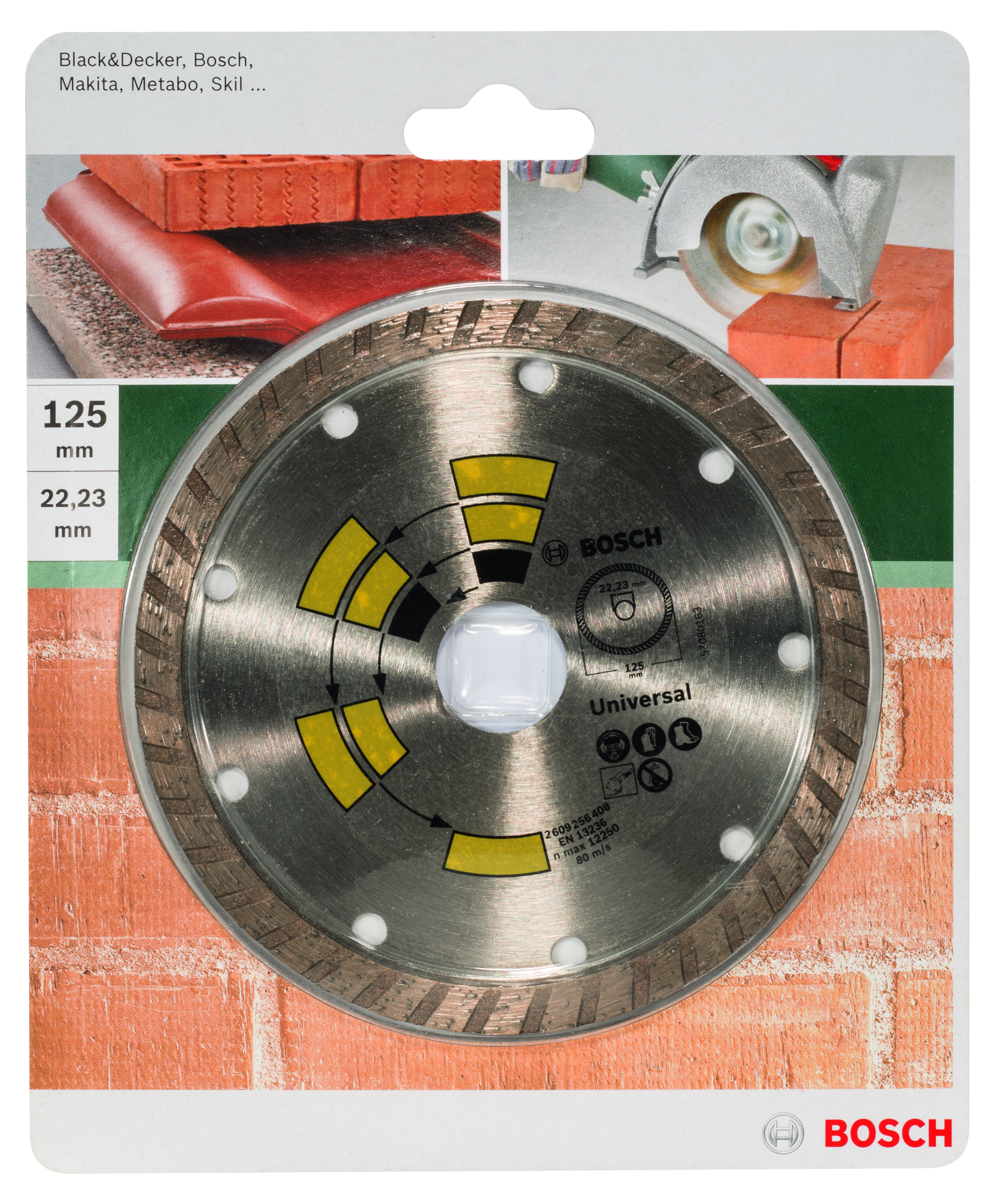 Emballage: 1Marque: BoschRéférence: 2609256408EAN: 3165140389068Description: DIAMANT MP (DISQUE DIAMANTÉS UNIVERSAL TURBO TOP , 125MM, 22.23)