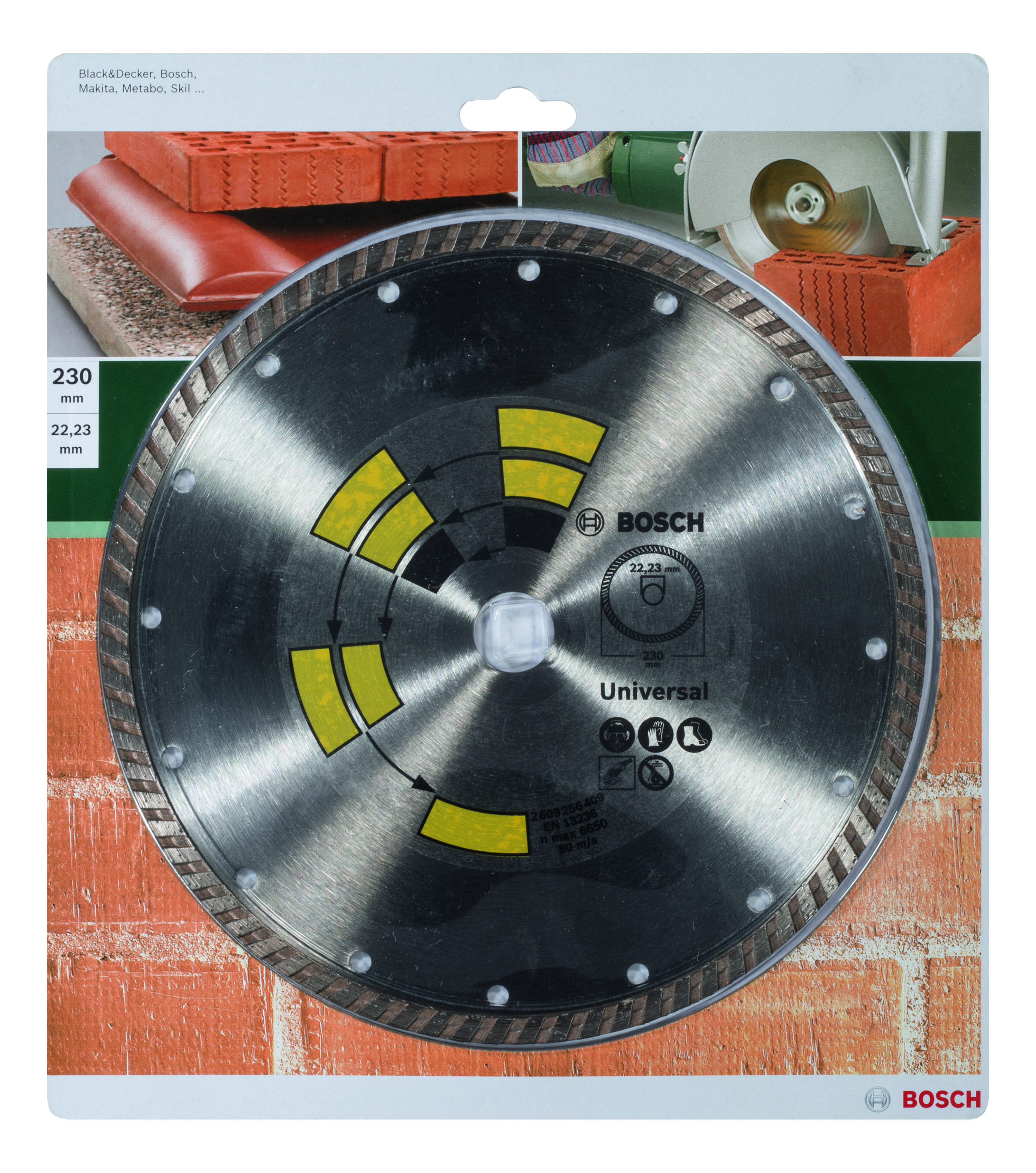 Emballage: 1Marque: BoschRéférence: 2609256409EAN: 3165140389075Description: DIAMANT MP (DISQUE DIAMANTÉS UNIVERSAL TURBO TOP , 230MM, 22.23)