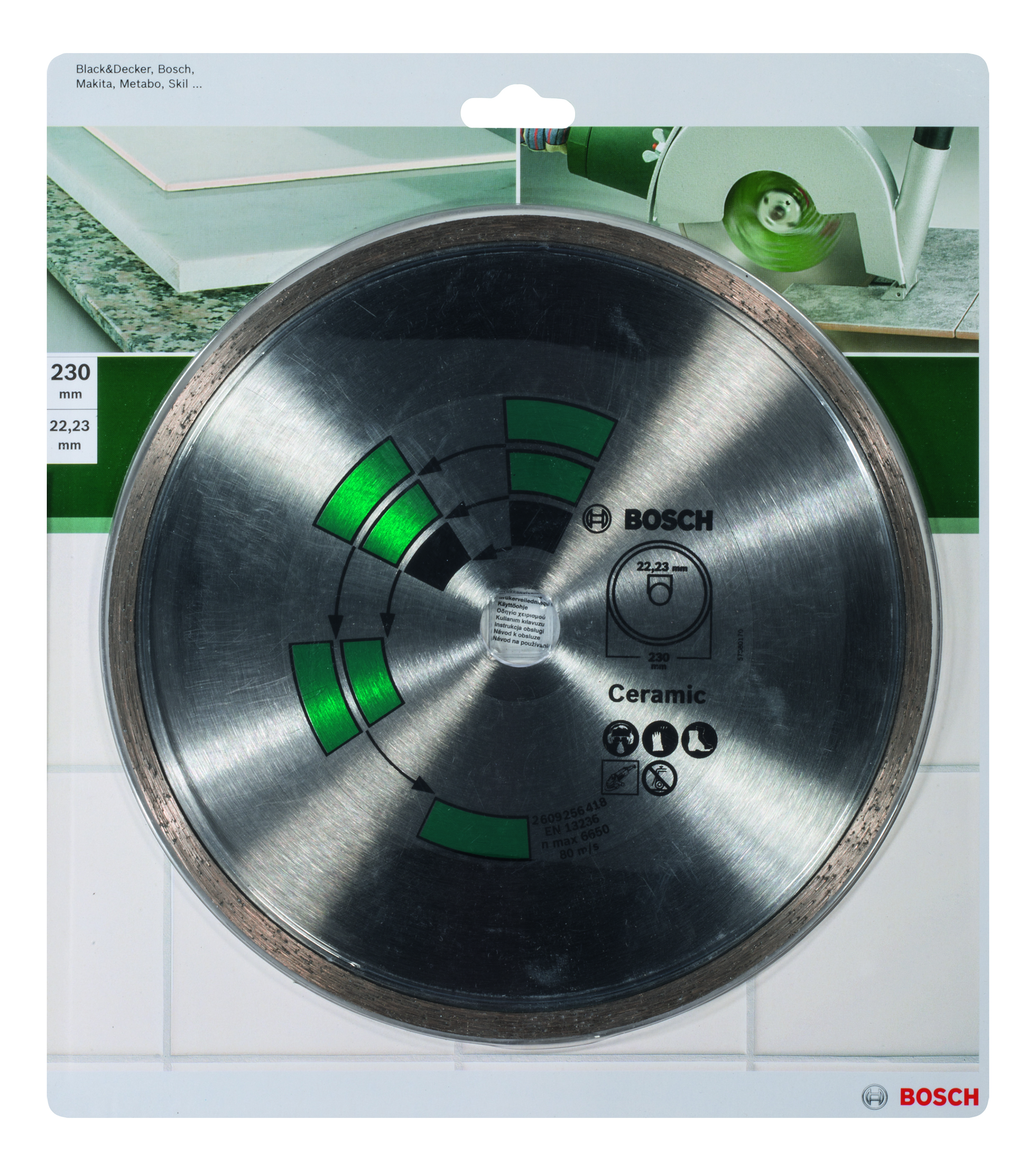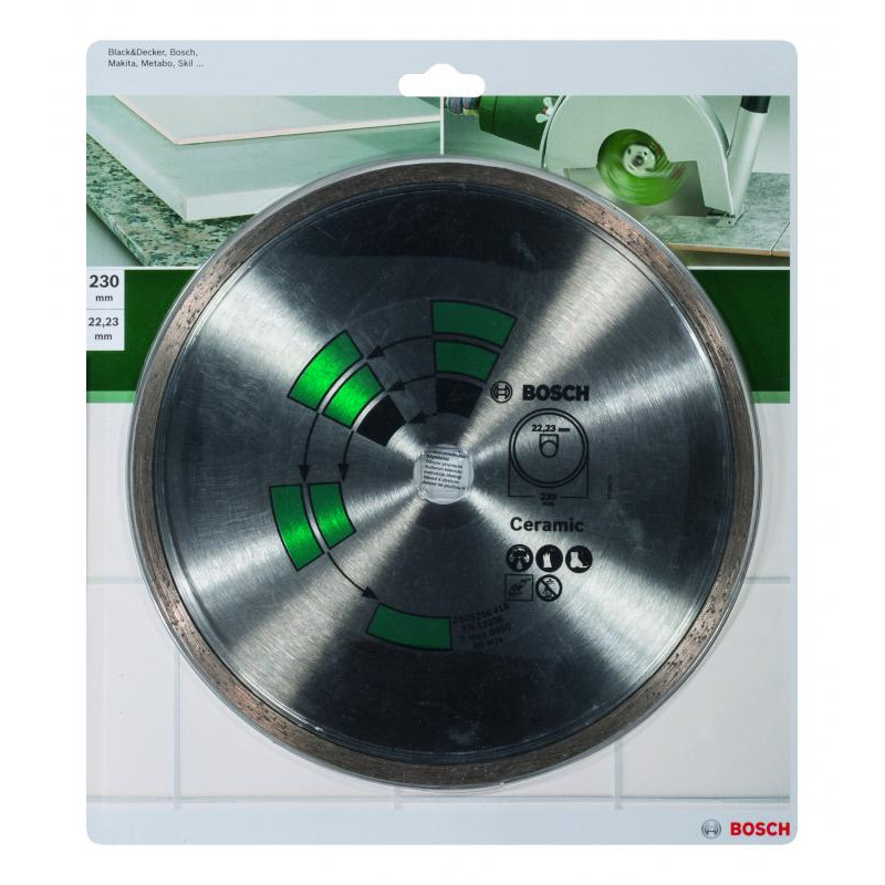 Emballage: 1Marque: BoschRéférence: 2609256418EAN: 3165140389167Description: DIAMANT MP (Disque diamantés carrelage céramique 230 mm,22.23)