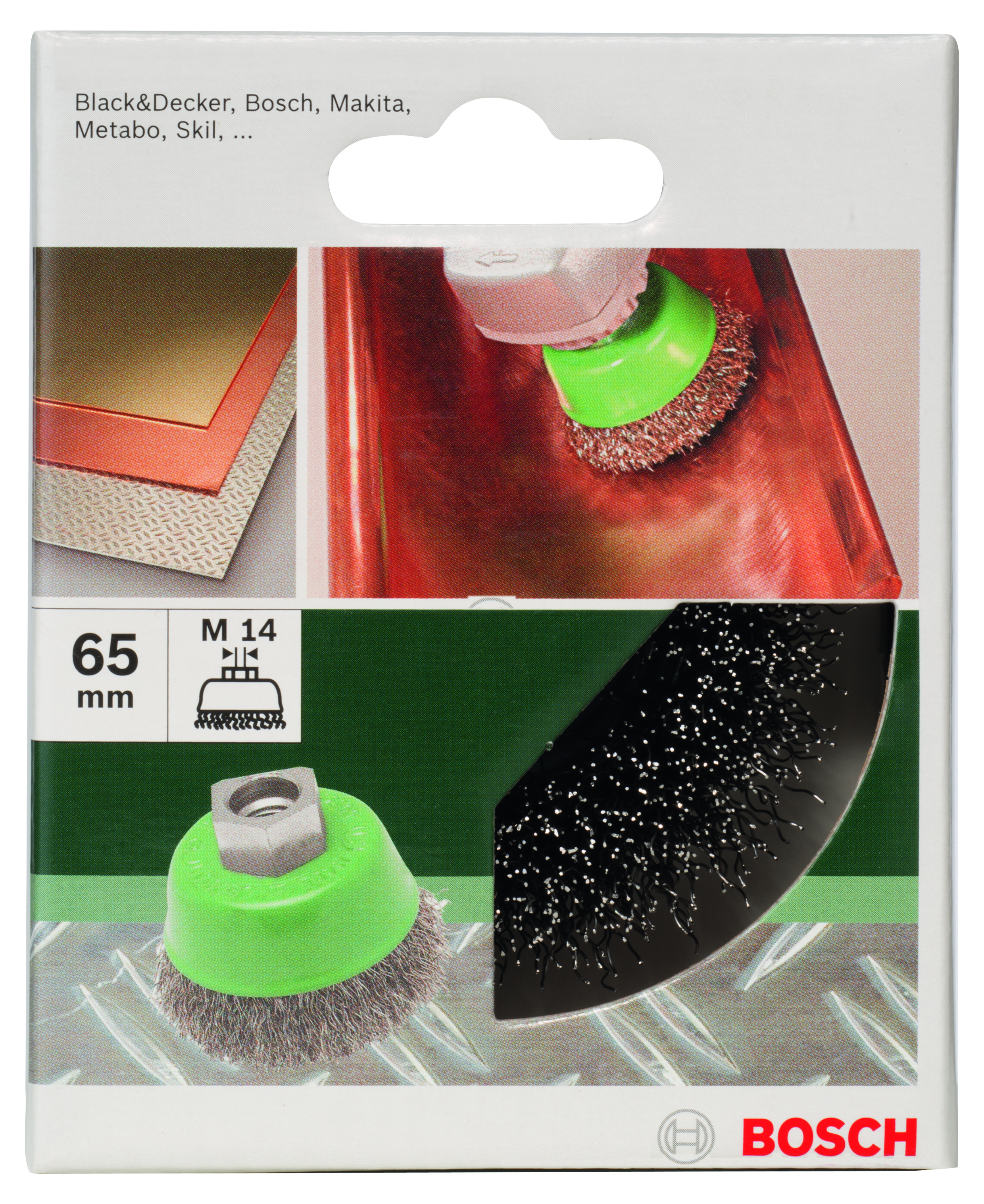 Emballage: 1Marque: BoschRéférence: 2609256501EAN: 3165140389204Description: BROSSES MP (BROSSE BOISSEAU A FILS ONDULÉS, INOXYDABLES, Ø 75 MM, M14 (1))