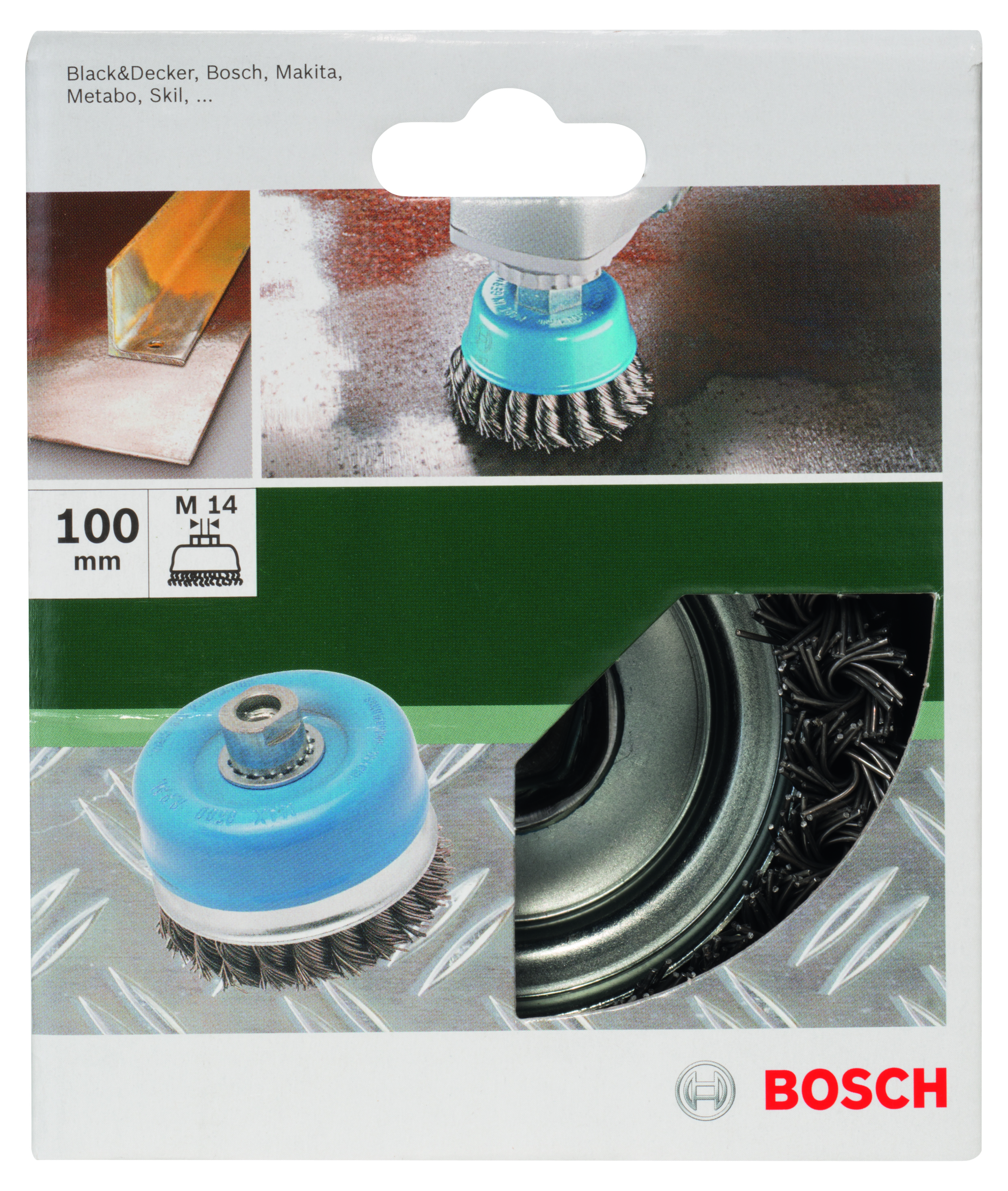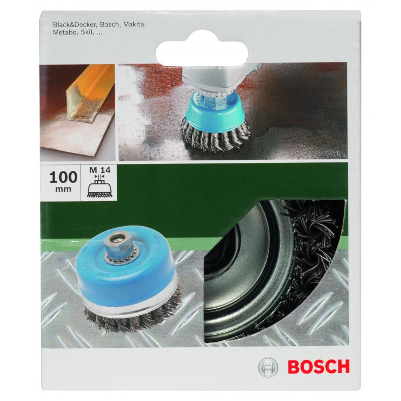 Emballage: 1Marque: BoschRéférence: 2609256508EAN: 3165140389273Description: BROSSES MP (BROSSE BOISSEAU A FILS TORSADÉS, , Ø 100 MM, M14 (1))