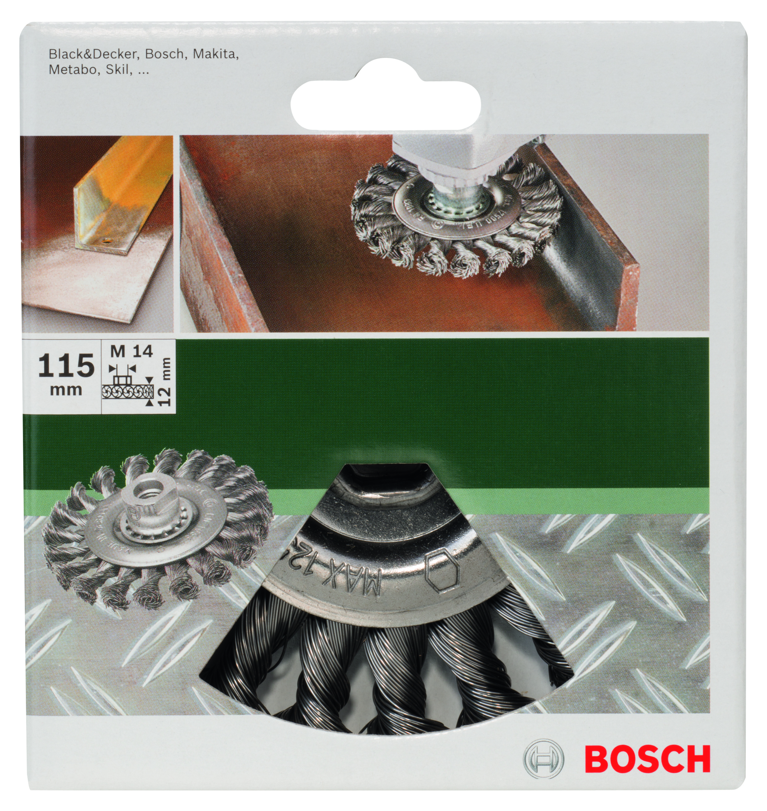 Emballage: 1Marque: BoschRéférence: 2609256512EAN: 3165140389310Description: BROSSES MP (BROSSE CONIQUE A FILS TORSADÉS, , Ø 115 MM, M14 (1))