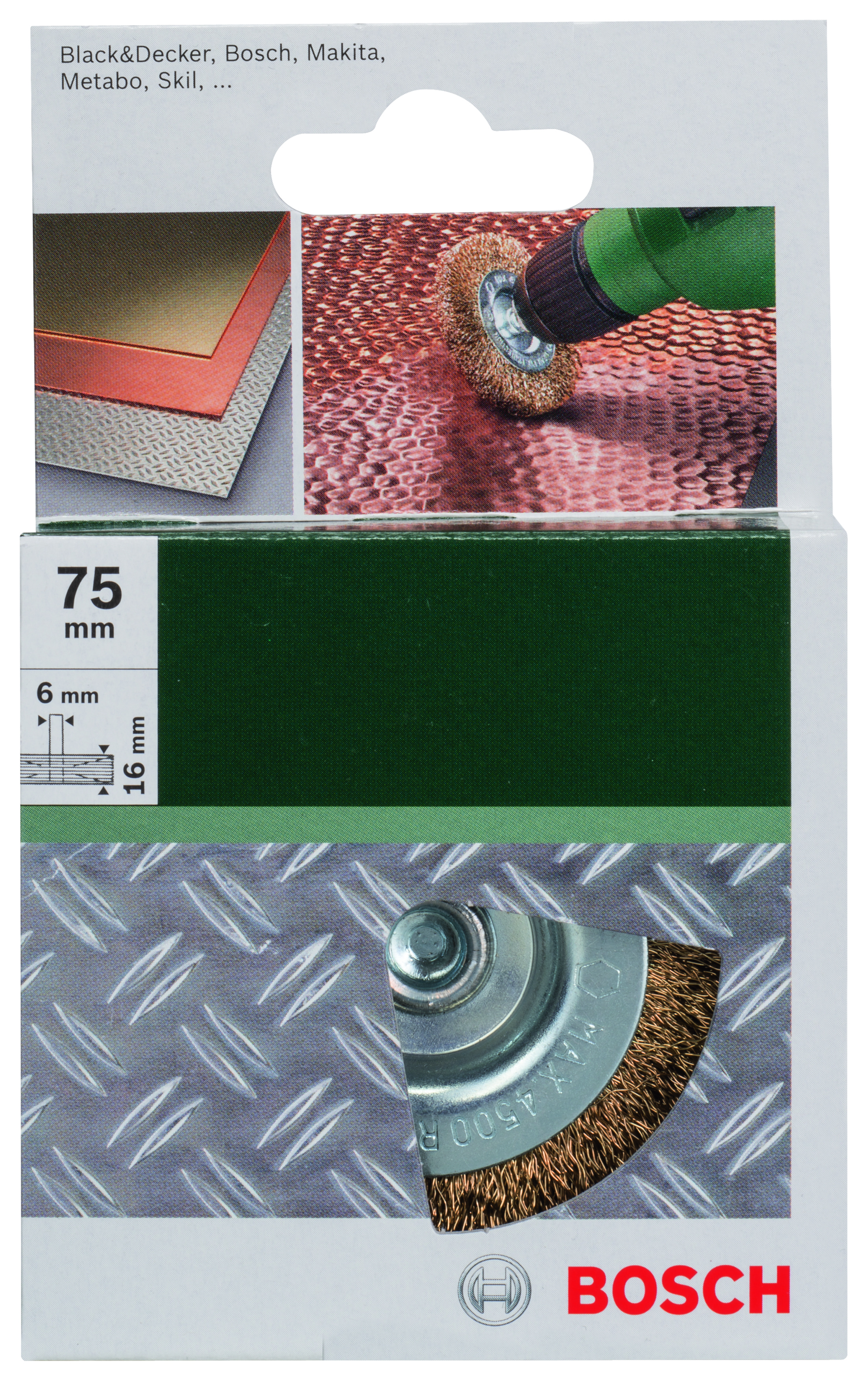 Emballage: 1Marque: BoschRéférence: 2609256519EAN: 3165140389389Description: BROSSES MP (BROSSE BOISSEAU A FILS ONDULÉS, LAITONNÉ, Ø 75 MM , 6 MM, (1))