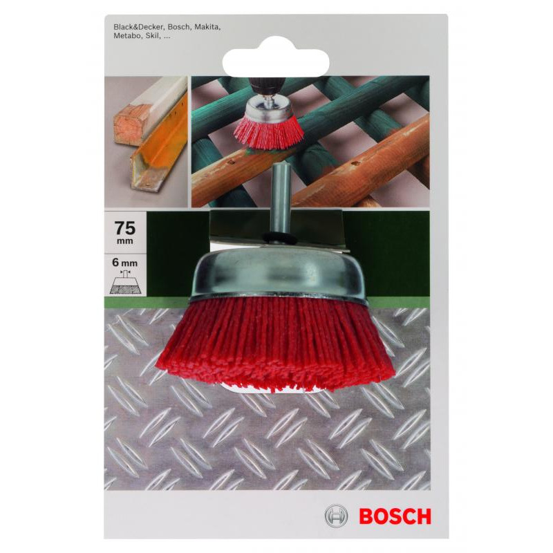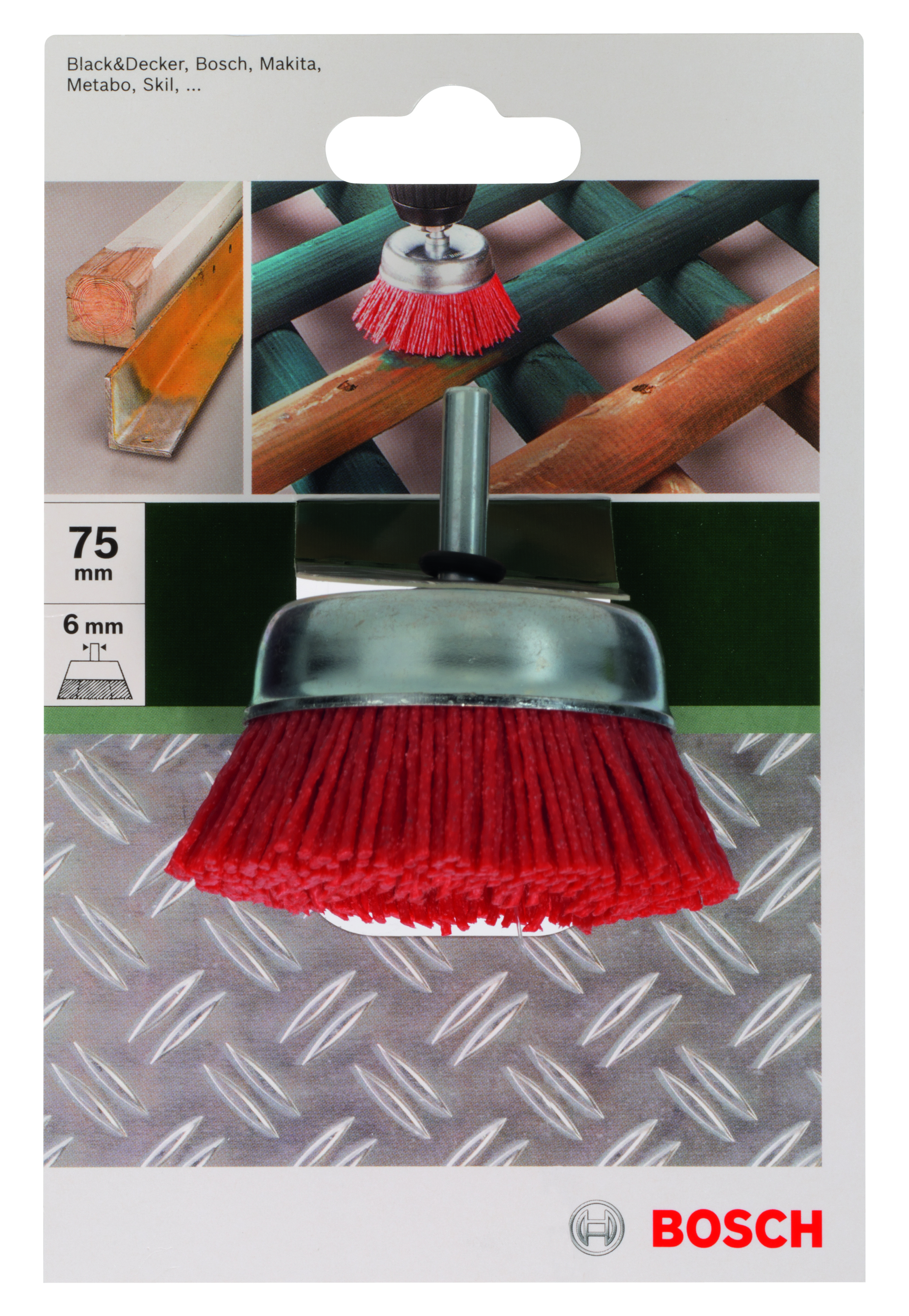 Emballage: 1 Marque: Bosch Référence: 2609256525 EAN: 3165140389440 Description: BROSSES MP (BROSSE BOISSEAU A FILS EN NYLON, SIC , Ø 75 MM , 6 MM, (1))
