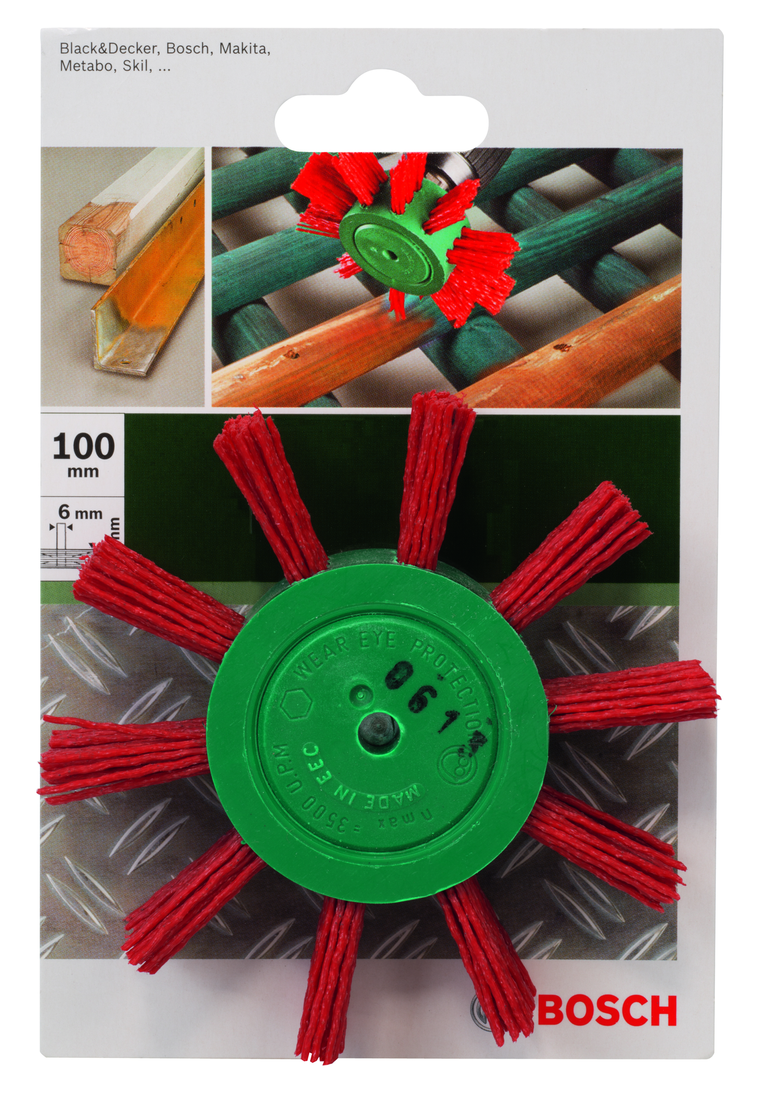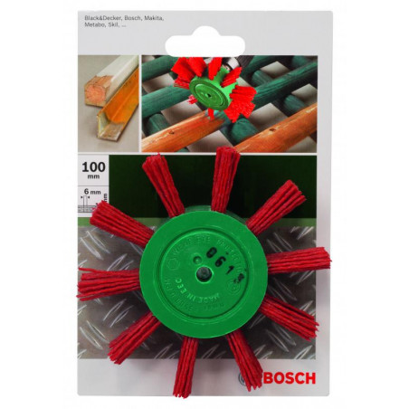 Emballage: 1 Marque: Bosch Référence: 2609256543 EAN: 3165140389624 Description: BROSSES MP (ROUE A LAMELLES A FILS EN NYLON, SIC , Ø 100 MM, 6 MM (1))