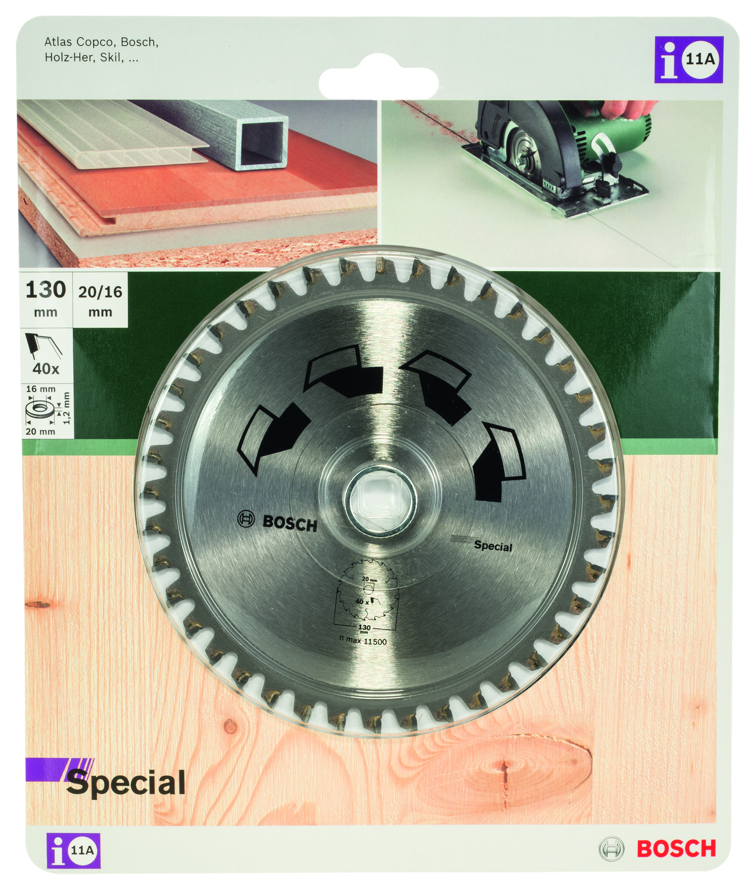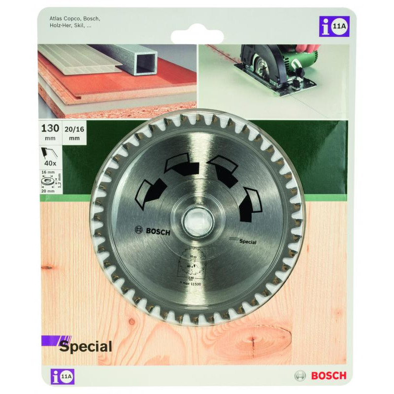Emballage: 1Marque: BoschRéférence: 2609256884EAN: 3165140392303Description: LAMES SCIES CIRC. MP (LAME DE SCIE CIRCULAIRE SPECIAL 130X2X20/16,D40 (1))