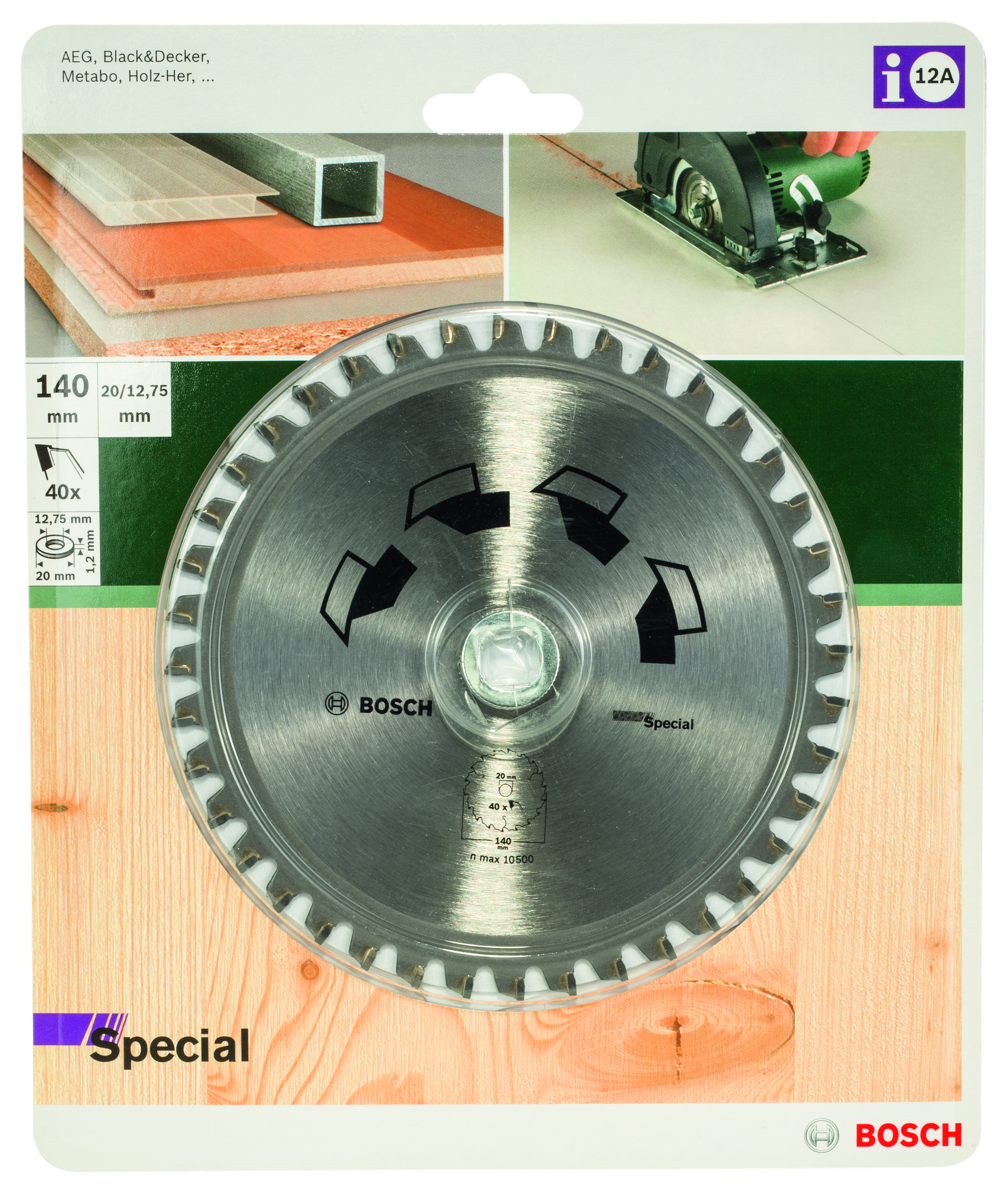Emballage: 1Marque: BoschRéférence: 2609256885EAN: 3165140392310Description: LAMES SCIES CIRC. MP (LAME DE SCIE CIRCULAIRE SPECIAL 140X2X20/12.7,D40 (1))