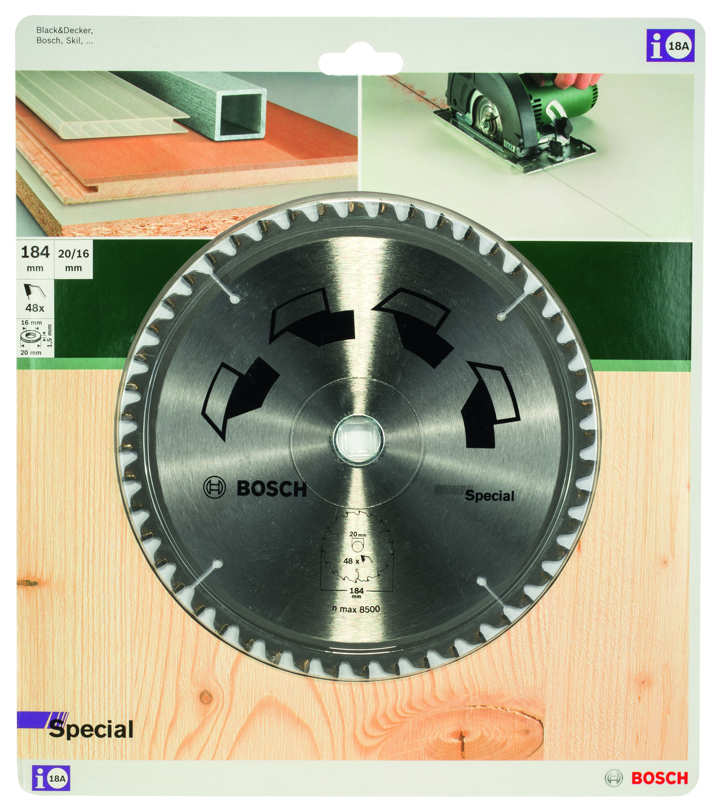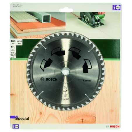Emballage: 1Marque: BoschRéférence: 2609256890EAN: 3165140392365Description: LAMES SCIES CIRC. MP (LAME DE SCIE CIRCULAIRE SPECIAL 184X2X16/-,D48 (1))