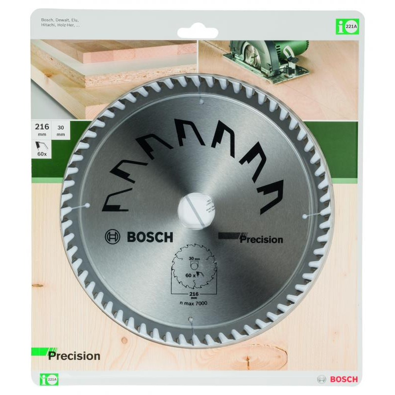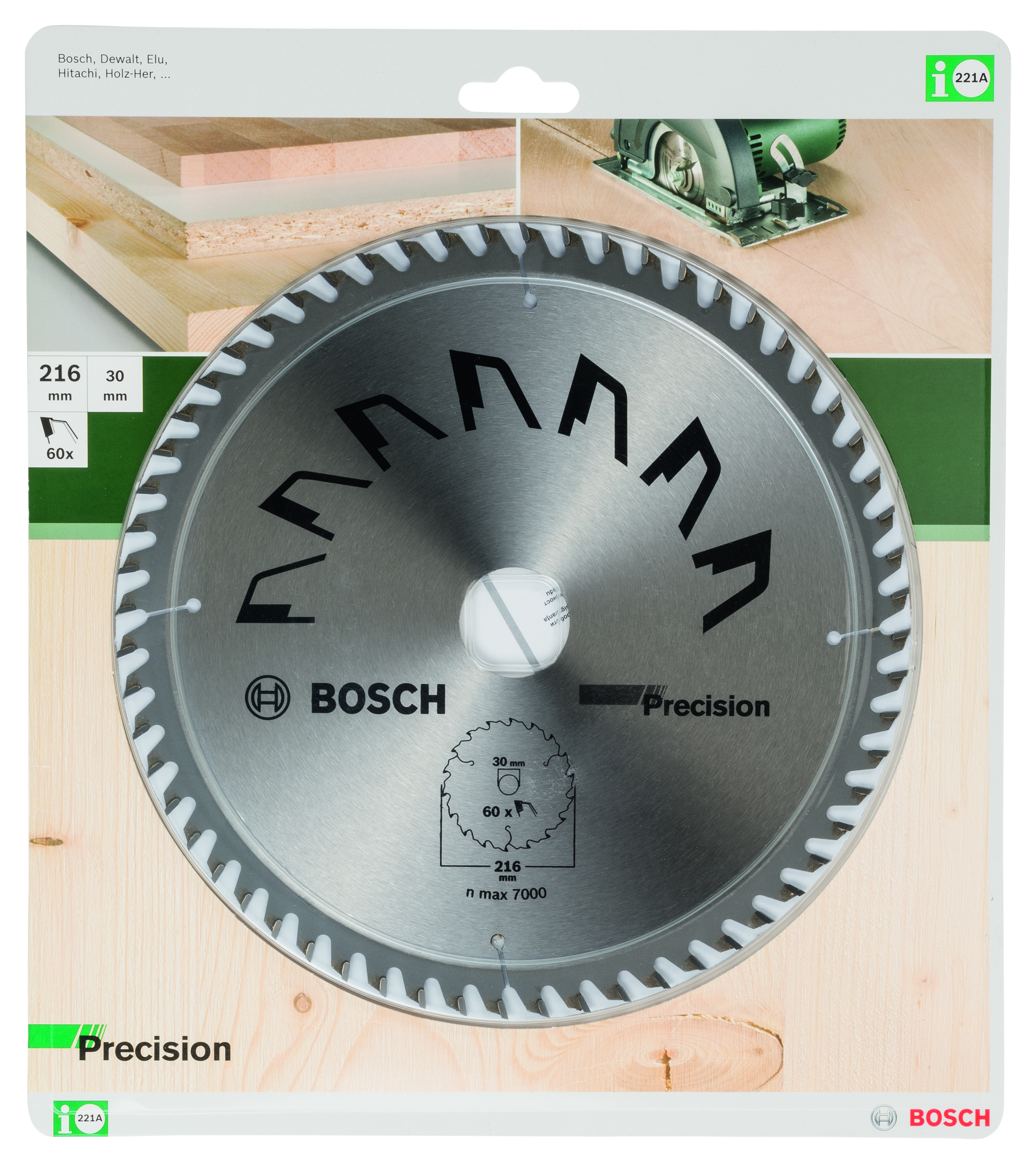 Emballage: 1Marque: BoschRéférence: 2609256935EAN: 3165140485562Description: LAMES SCIES CIRC. MP (Lame de scie circulaire precision 216x30 T60)