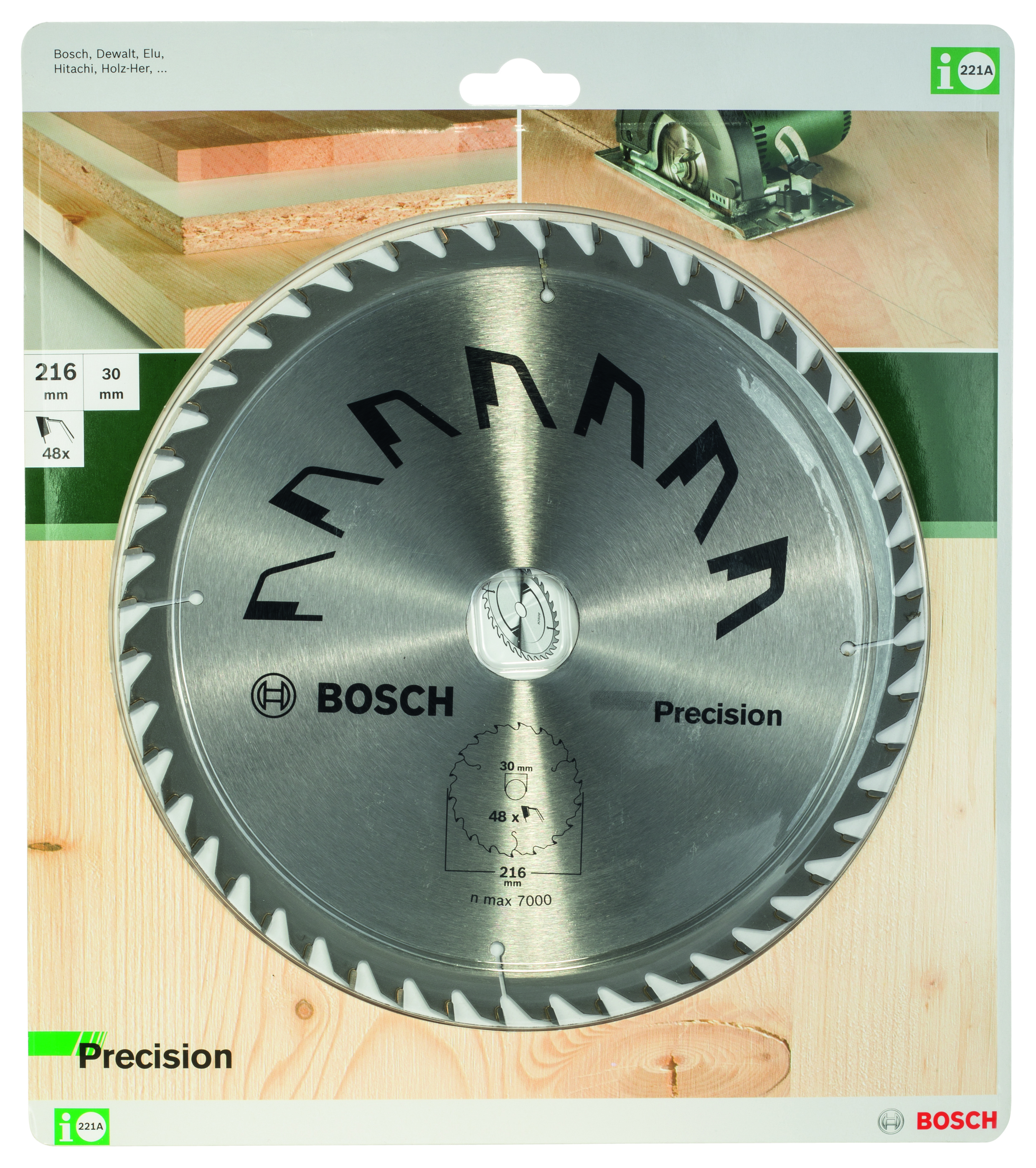 Emballage: 1Marque: BoschRéférence: 2609256936EAN: 3165140485579Description: LAMES SCIES CIRC. MP (Lame de scie circulaire precision 216x30 T48)