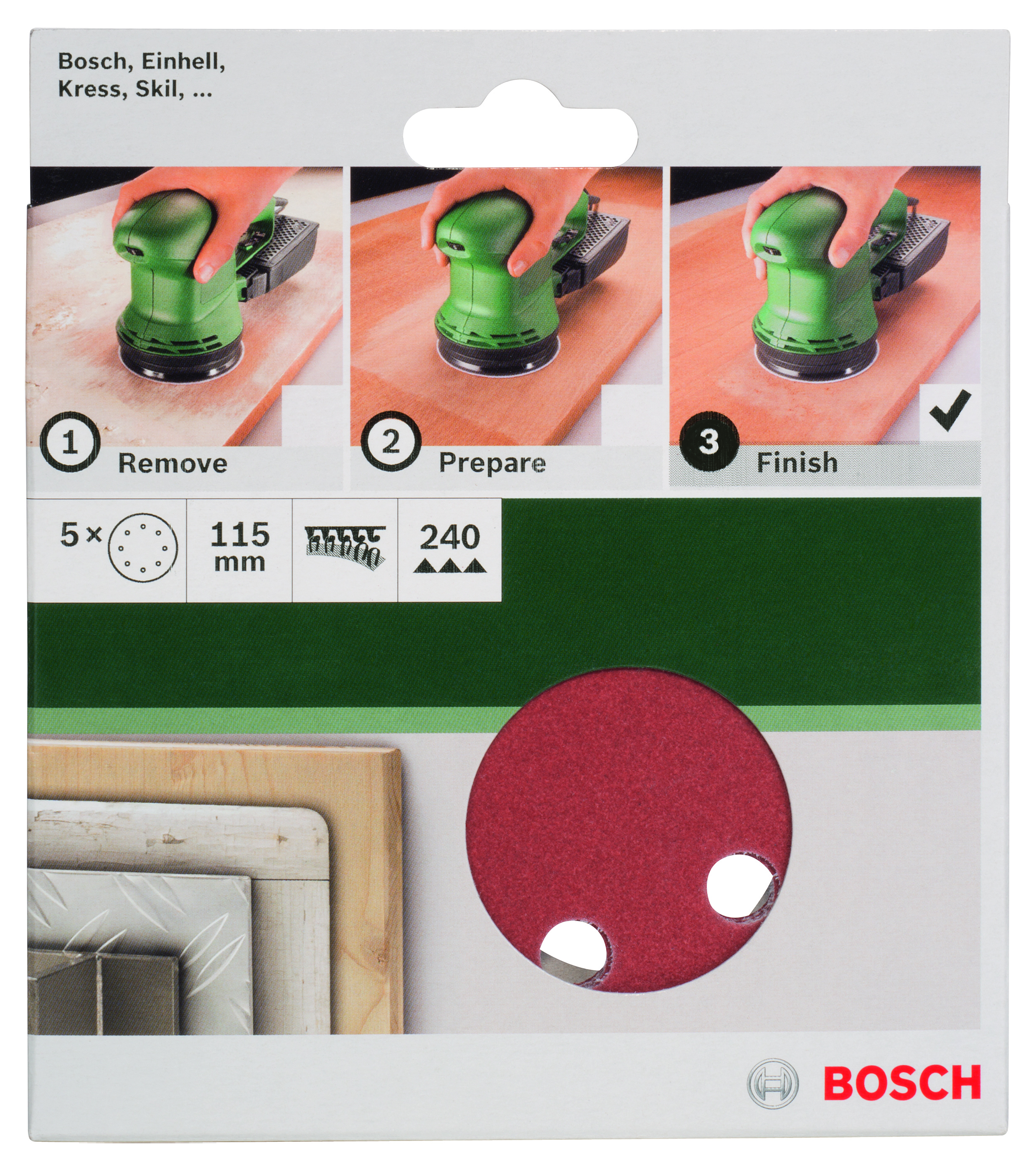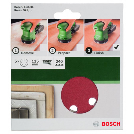 Emballage: 5Marque: BoschRéférence: 2609256A20EAN: 3165140614368Description: PONÇAGE MP (FEUILLE ABRASIVE Ø 115 MM, G240, WP, 8 TROUS, VELCRO (5))