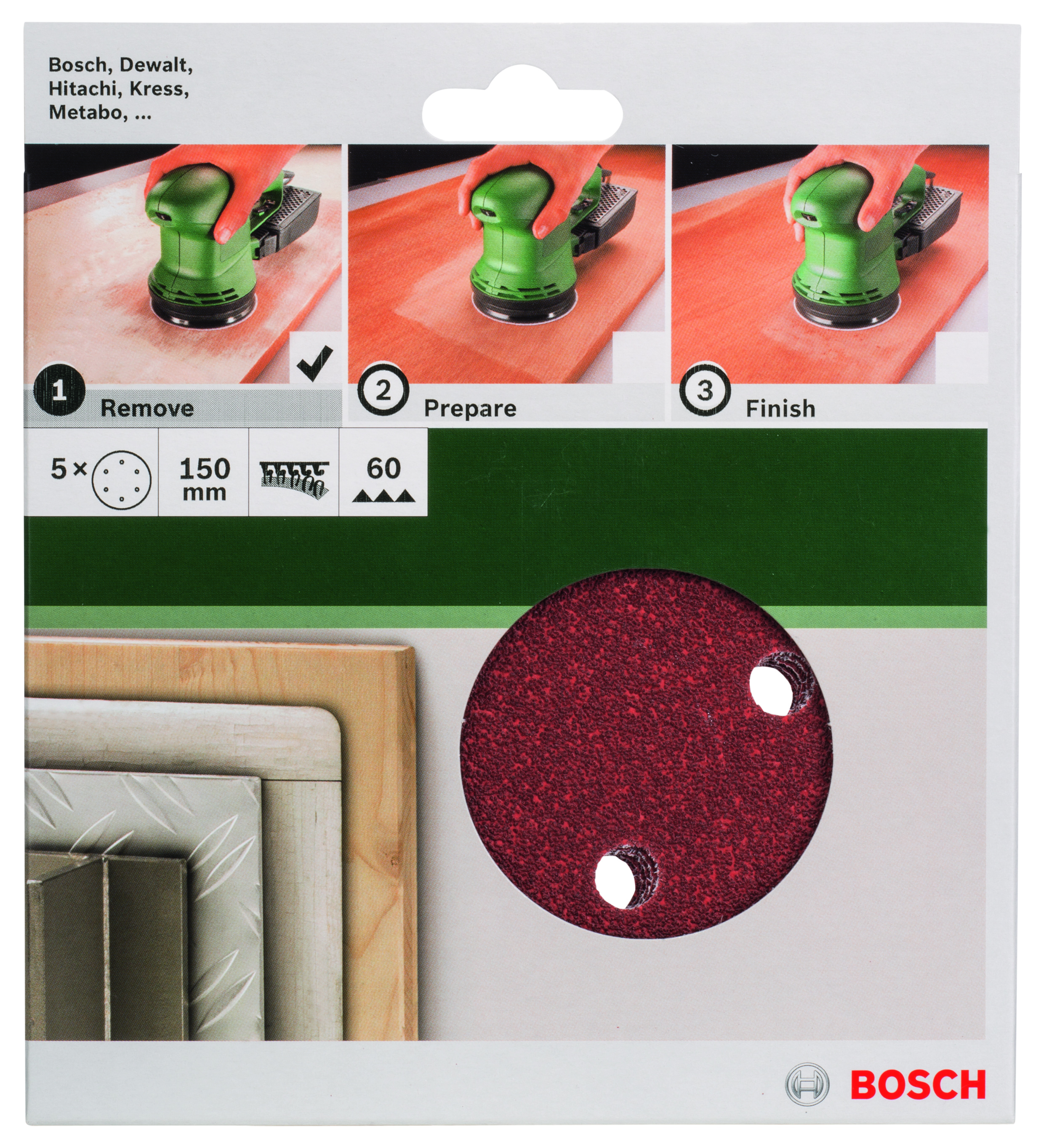 Emballage: 5Marque: BoschRéférence: 2609256A30EAN: 3165140614467Description: PONÇAGE MP (FEUILLE ABRASIVE Ø 150 MM, G60, WP, 6 TROUS, VELCRO (5))