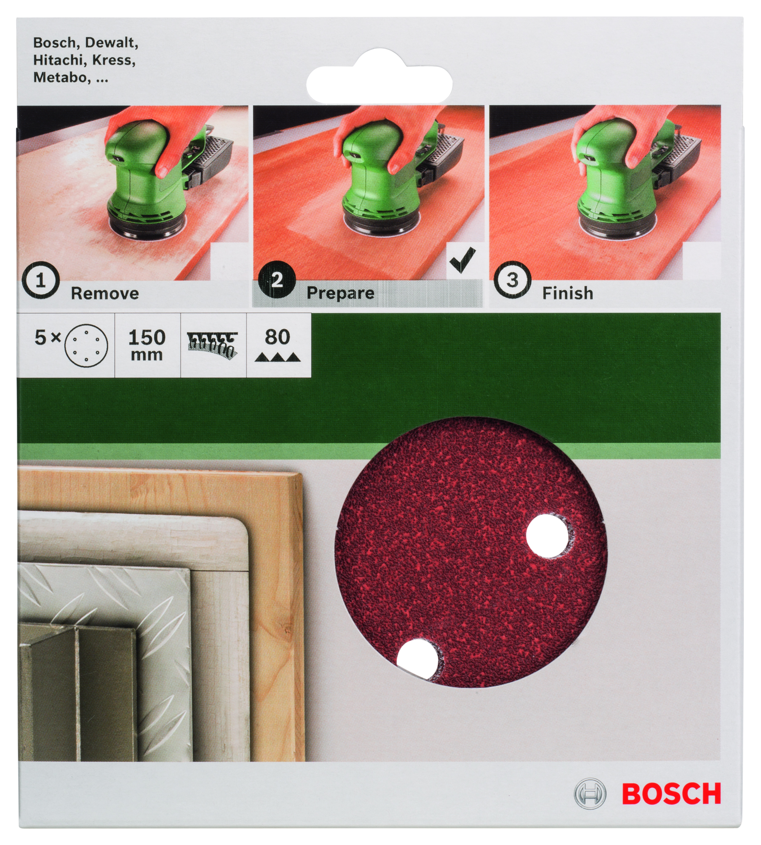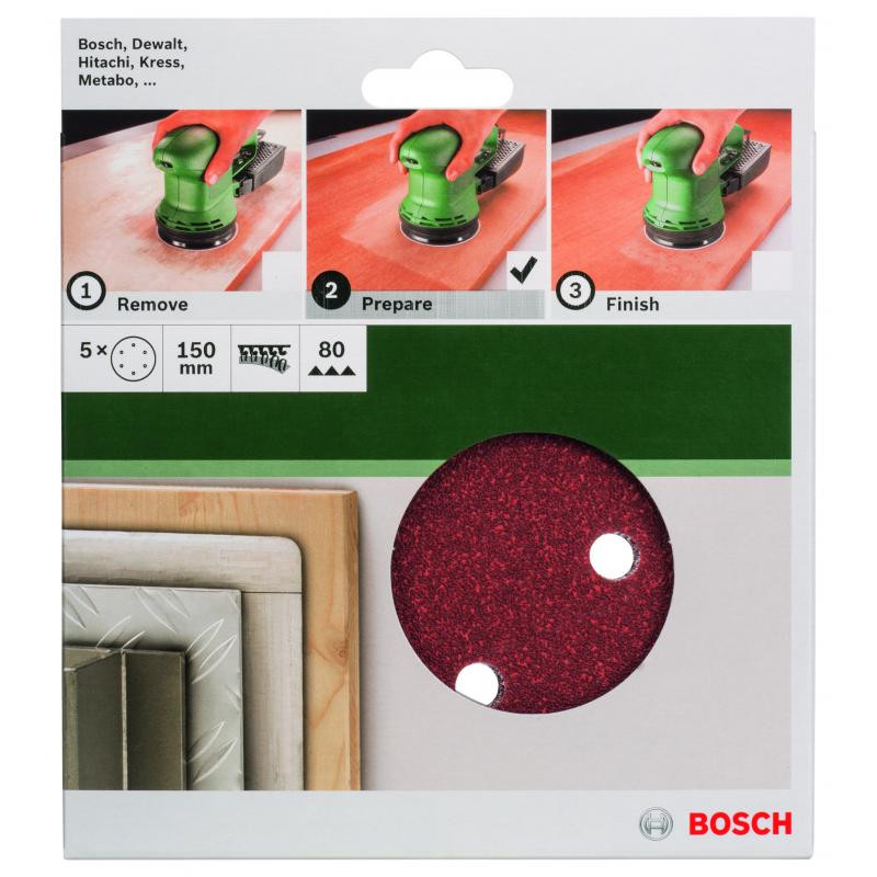 Emballage: 5Marque: BoschRéférence: 2609256A31EAN: 3165140614474Description: PONÇAGE MP (FEUILLE ABRASIVE Ø 150 MM, G80, PAINT, 6 TROUS, VELCRO, (5))