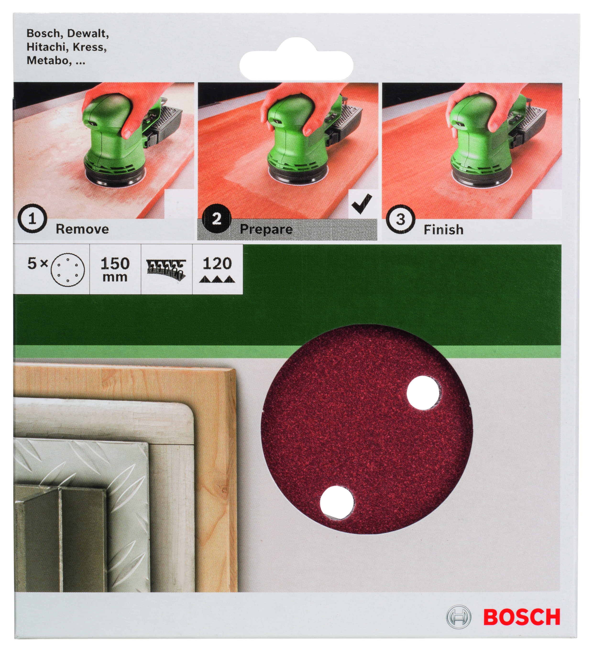 Emballage: 5Marque: BoschRéférence: 2609256A32EAN: 3165140614481Description: PONÇAGE MP (FEUILLE ABRASIVE Ø 150 MM, G120, WP, 6 TROUS, VELCRO (5))