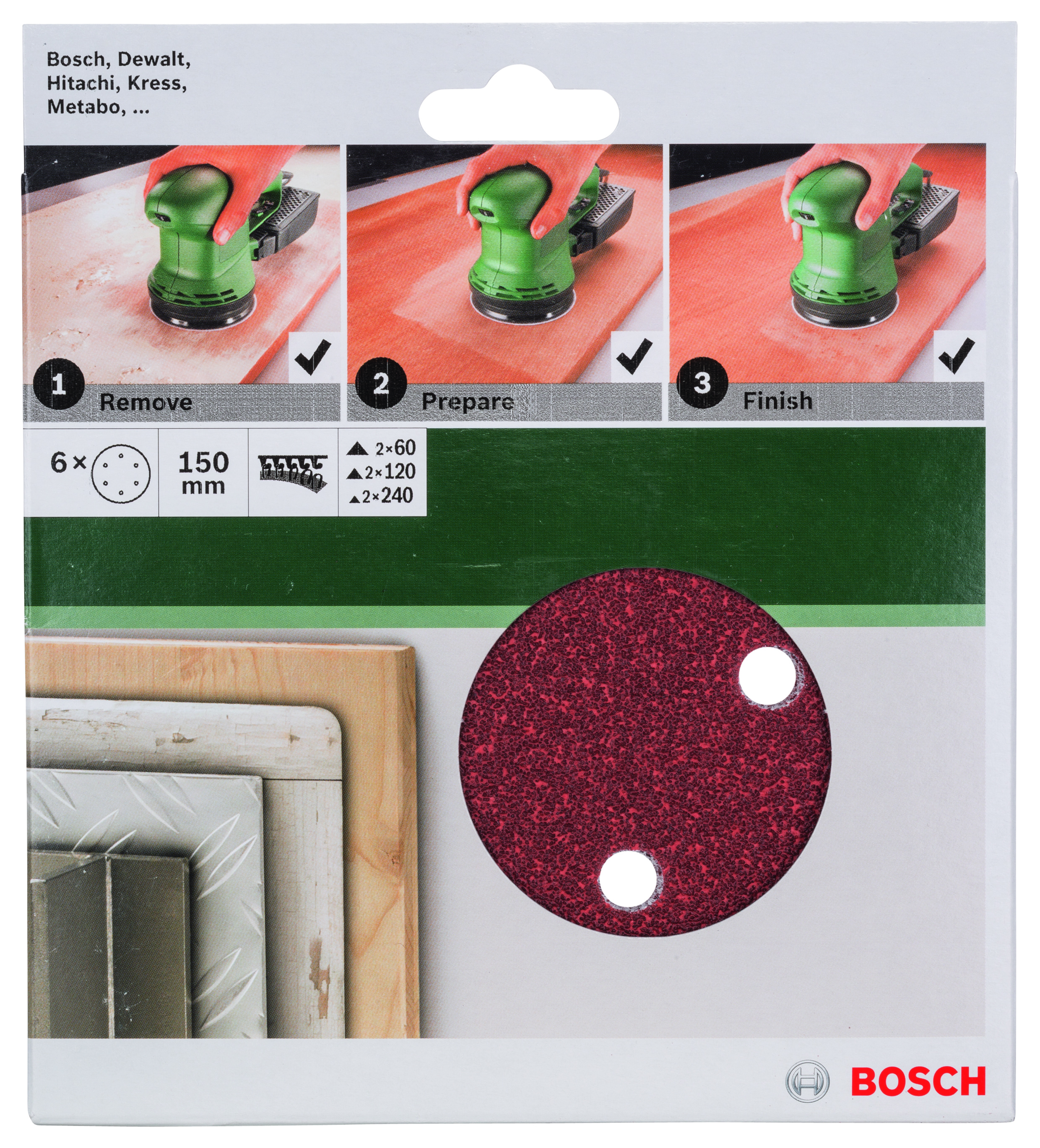 Emballage: 6Marque: BoschRéférence: 2609256A35EAN: 3165140614511Description: PONÇAGE MP (SET FEUILLE ABRASIVE Ø 150 MM, WP, 6 TROUS, VELCRO (6))