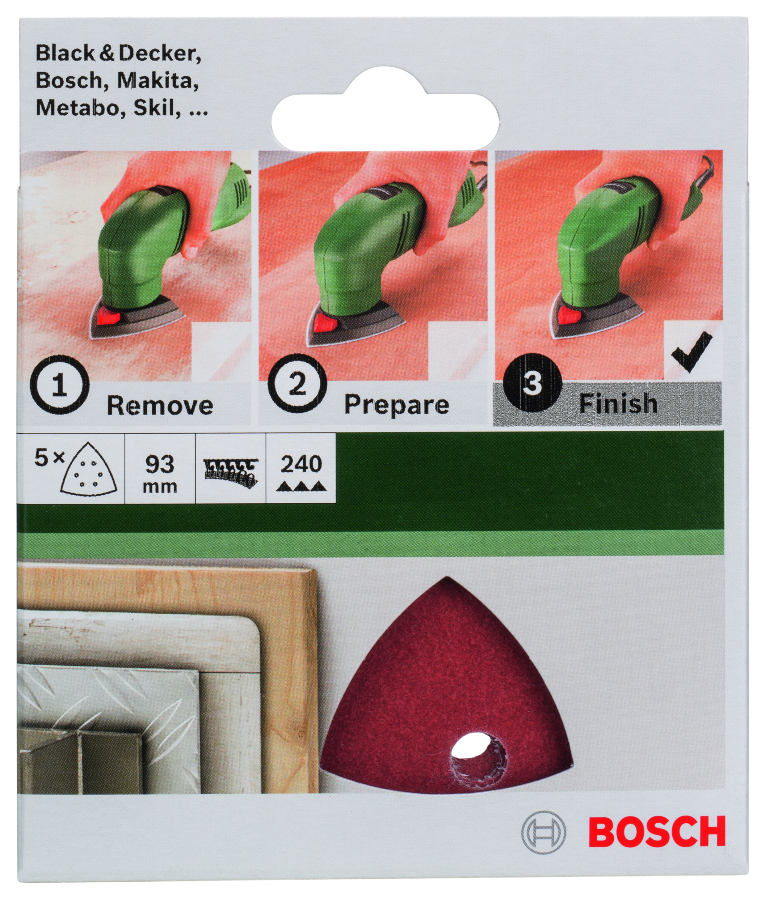 Emballage: 5Marque: BoschRéférence: 2609256A53EAN: 3165140614696Description: PONÇAGE MP (FEUILLE ABRASIVE 93 MM, G240, WP, 6 TROUS, VELCRO (5))