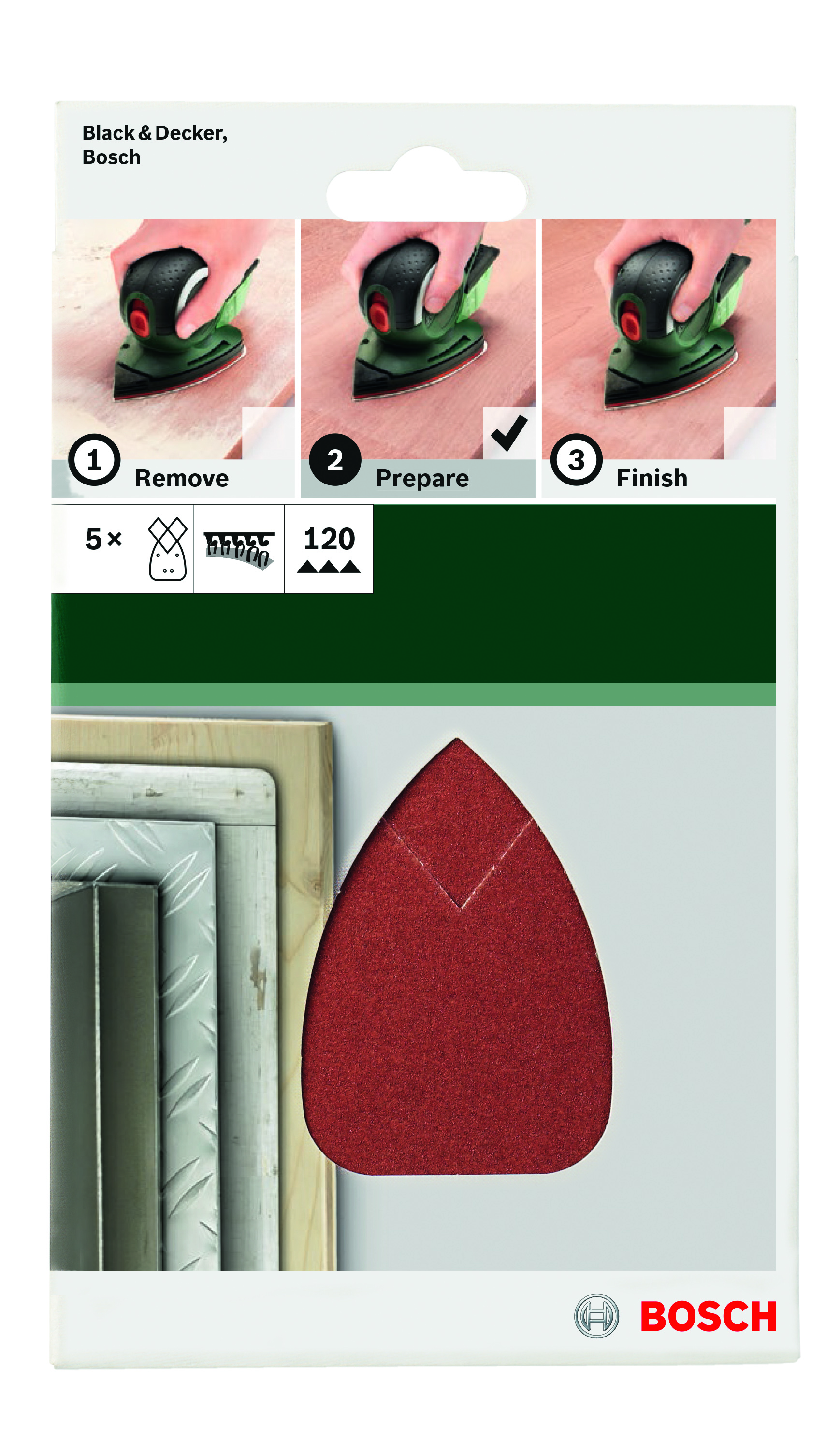 Emballage: 5Marque: BoschRéférence: 2609256A70EAN: 3165140614863Description: PONÇAGE MP (FEUILLE ABRASIVE 95X135 MM, G120, RW, 4 TROUS, VELCRO (5))