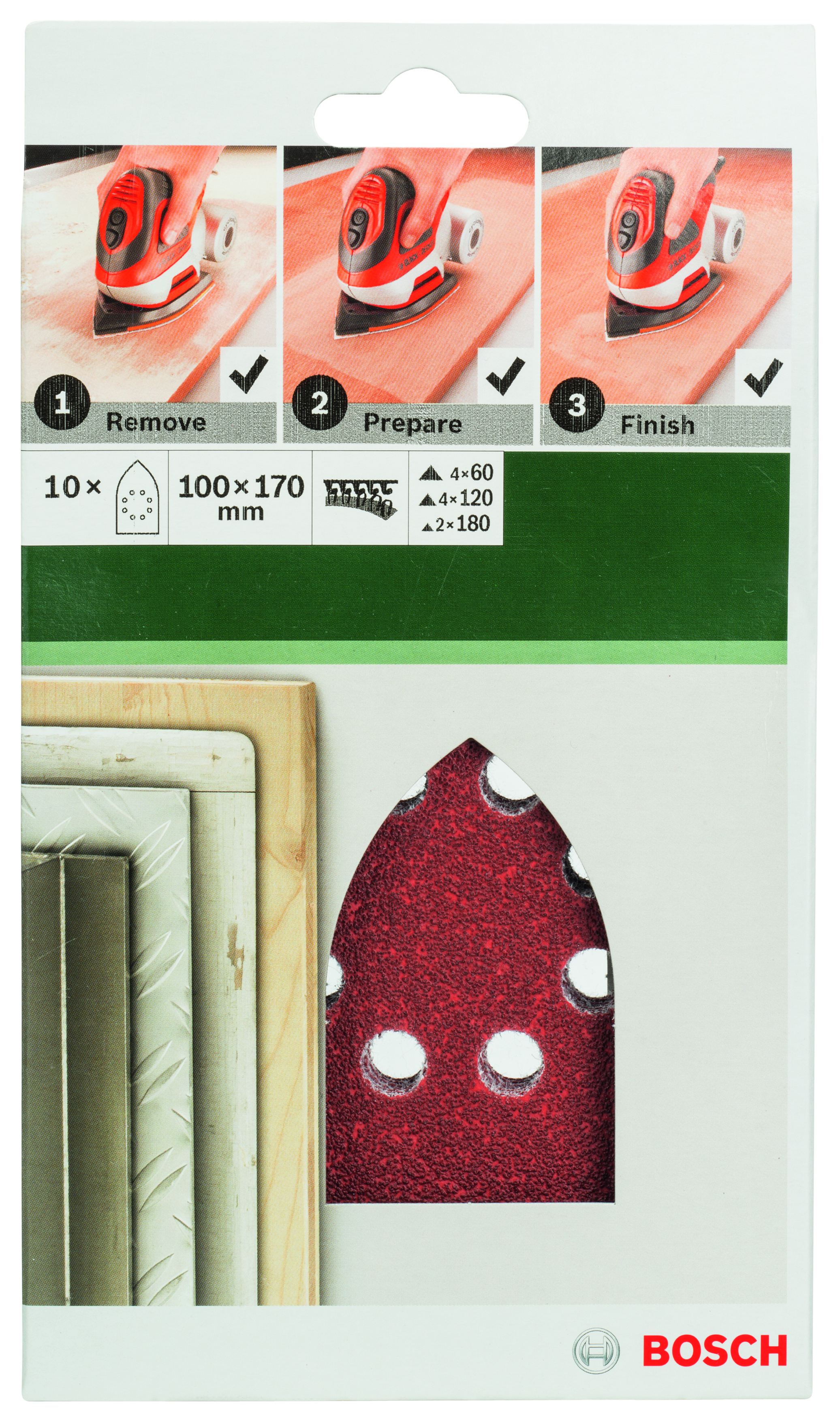 Emballage: 10Marque: BoschRéférence: 2609256A79EAN: 3165140614955Description: PONÇAGE MP (SET FEUILLE ABRASIVE 100X160 MM WITH EARS, RW, 8 TROUS, VELCRO (10))