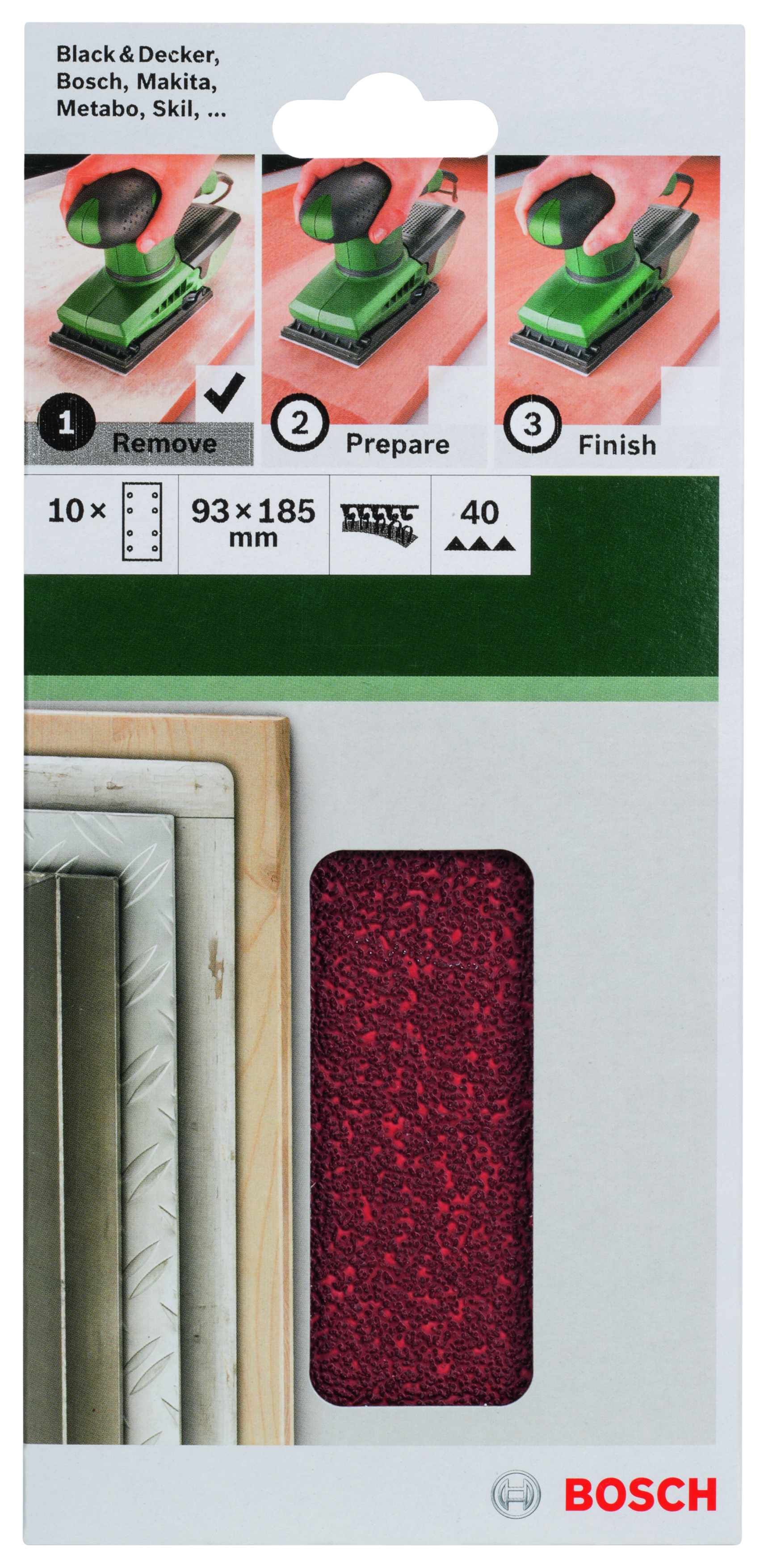 Emballage: 10Marque: BoschRéférence: 2609256A80EAN: 3165140614962Description: PONÇAGE MP (FEUILLE ABRASIVE 93X185 MM, G40, WP, 8 TROUS, VELCRO (10))