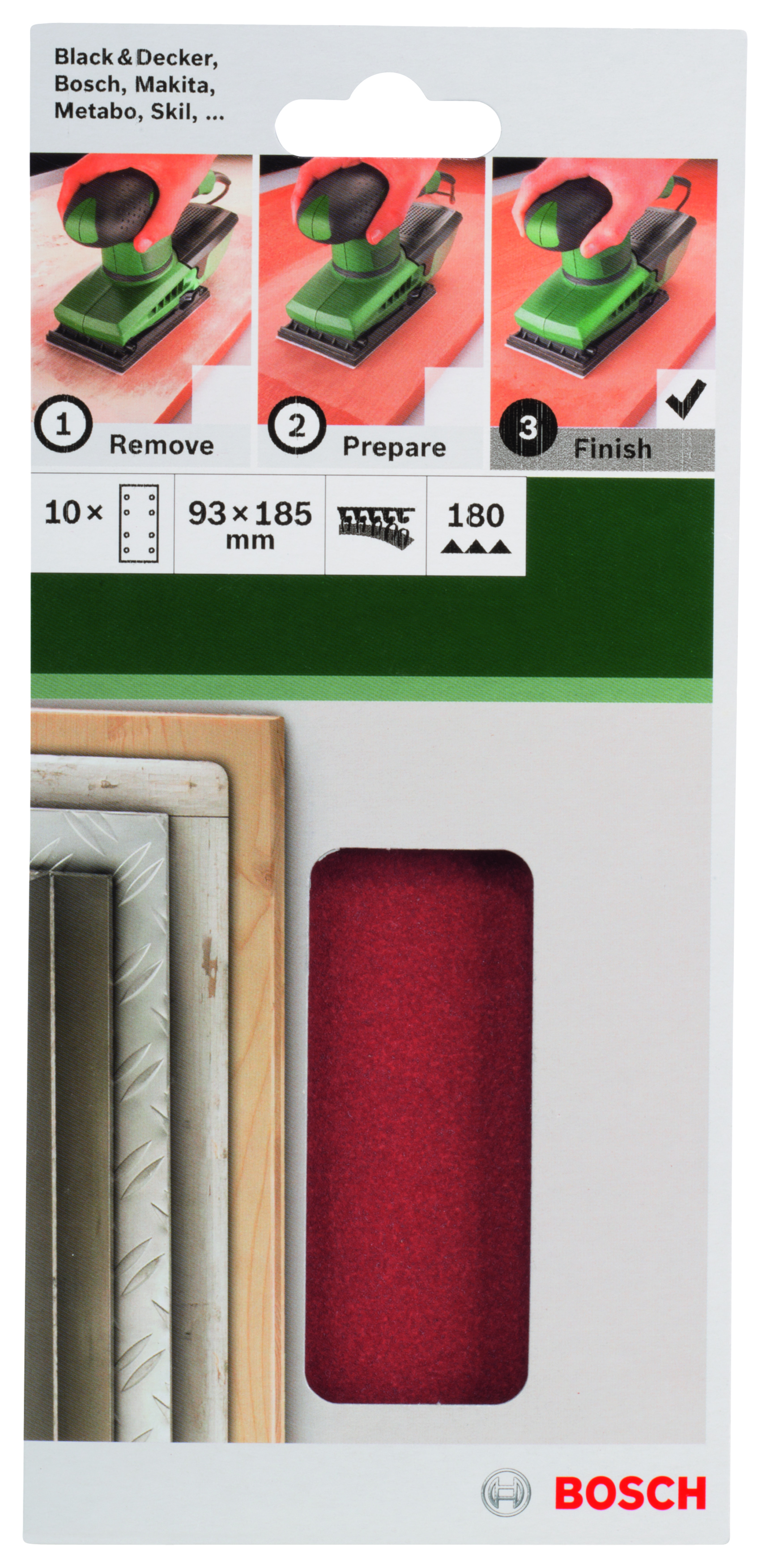 Emballage: 10Marque: BoschRéférence: 2609256A84EAN: 3165140615006Description: PONÇAGE MP (FEUILLE ABRASIVE 93X185 MM, G180, PAINT, 8 TROUS, VELCRO, (10))