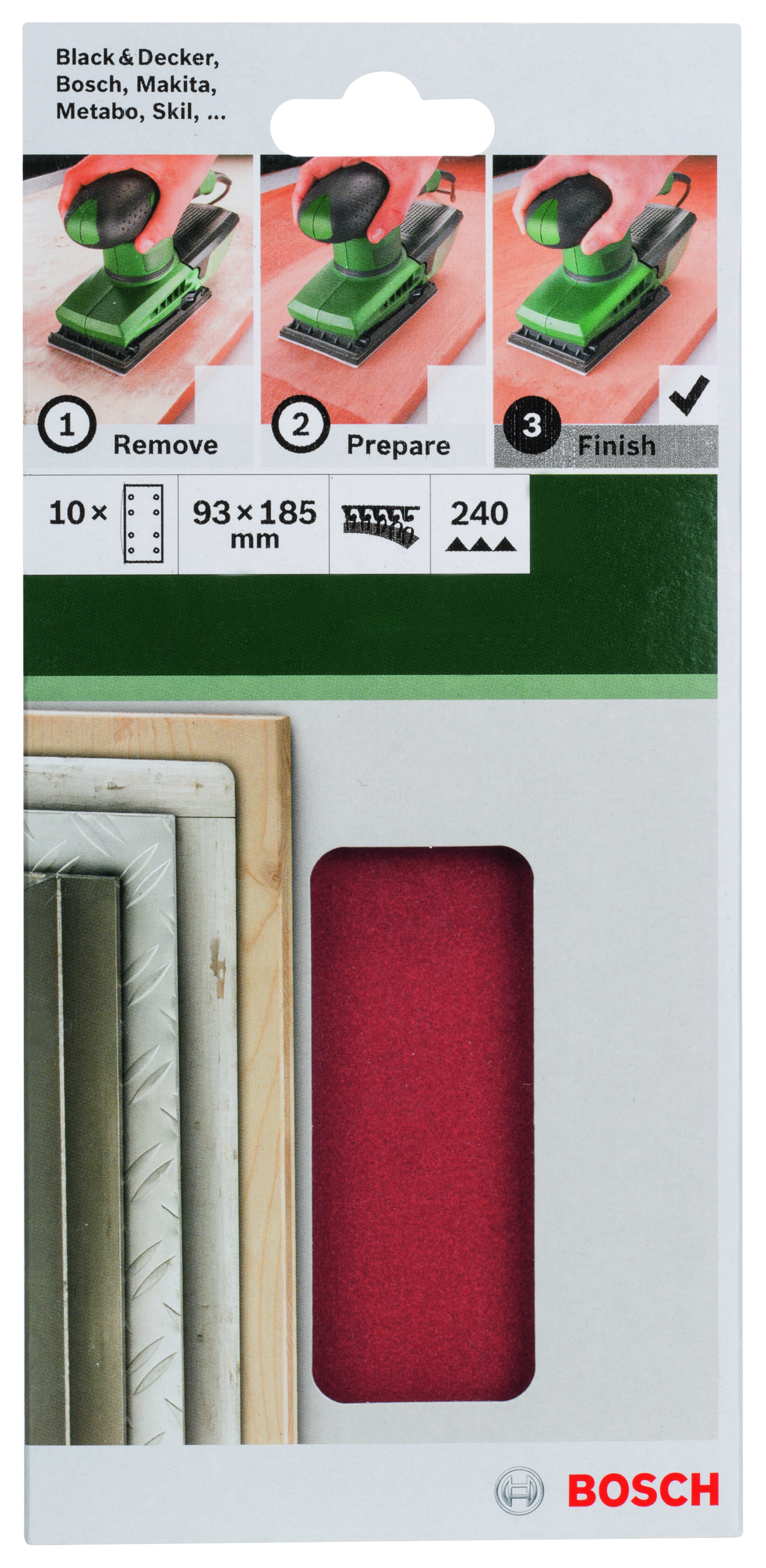 Emballage: 10Marque: BoschRéférence: 2609256A85EAN: 3165140615013Description: PONÇAGE MP (FEUILLE ABRASIVE 93X185 MM, G240 , WP, 8 TROUS, VELCRO (10))