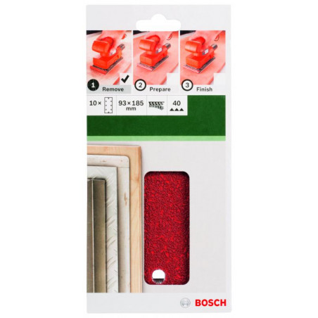 Emballage: 10Marque: BoschRéférence: 2609256A87EAN: 3165140615037Description: PONÇAGE MP (FEUILLE ABRASIVE 93X185 MM, G40, RW, 8 TROUS, VELCRO (10))