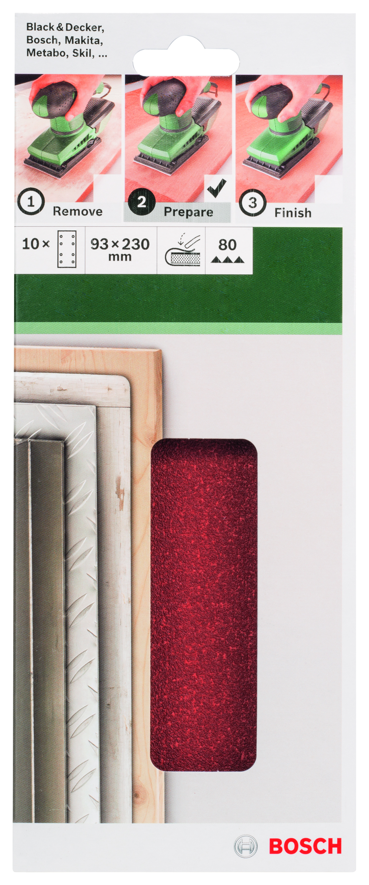 Emballage: 10Marque: BoschRéférence: 2609256A96EAN: 3165140615129Description: PONÇAGE MP (FEUILLE ABRASIVE 93X230 MM, G80, WOOD, 8 TROUS, FIXATION ÉTRIER, (10))