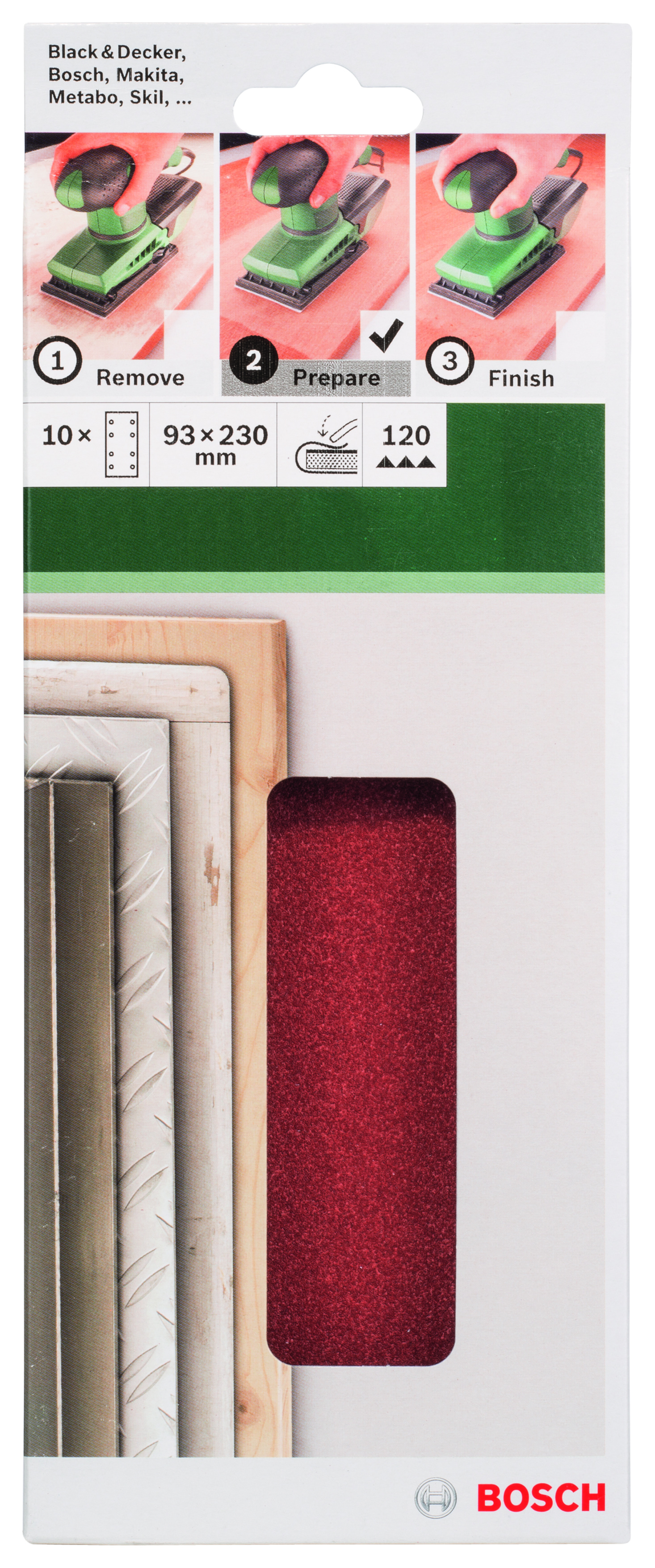 Emballage: 10Marque: BoschRéférence: 2609256A97EAN: 3165140615136Description: PONÇAGE MP (FEUILLE ABRASIVE 93X230 MM, G120, RW, 8 TROUS, FIXATION ÉTRIER (10))