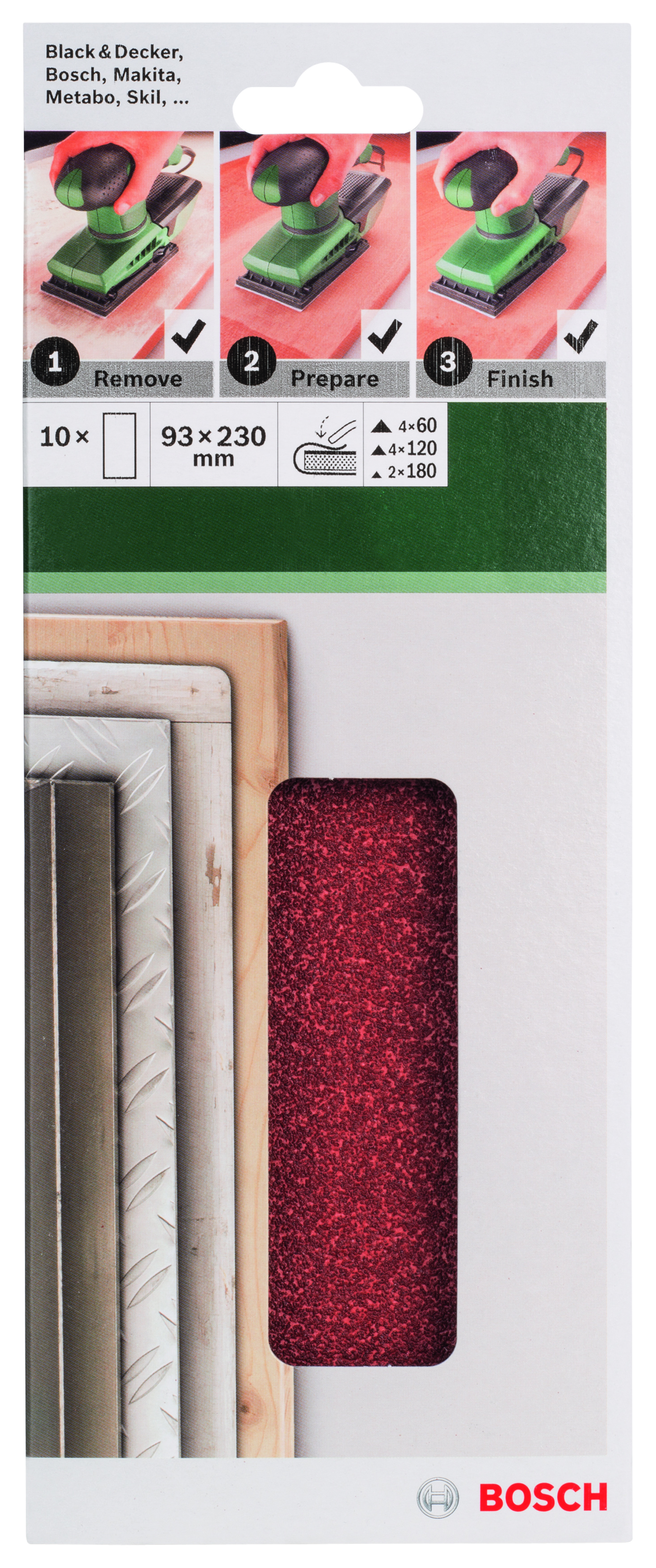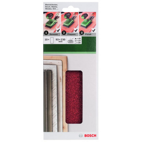 Emballage: 10Marque: BoschRéférence: 2609256B14EAN: 3165140615303Description: PONÇAGE MP (SET FEUILLE ABRASIVE 93X230 MM, RW, NON PERF., FIXATION ÉTRIER (10))